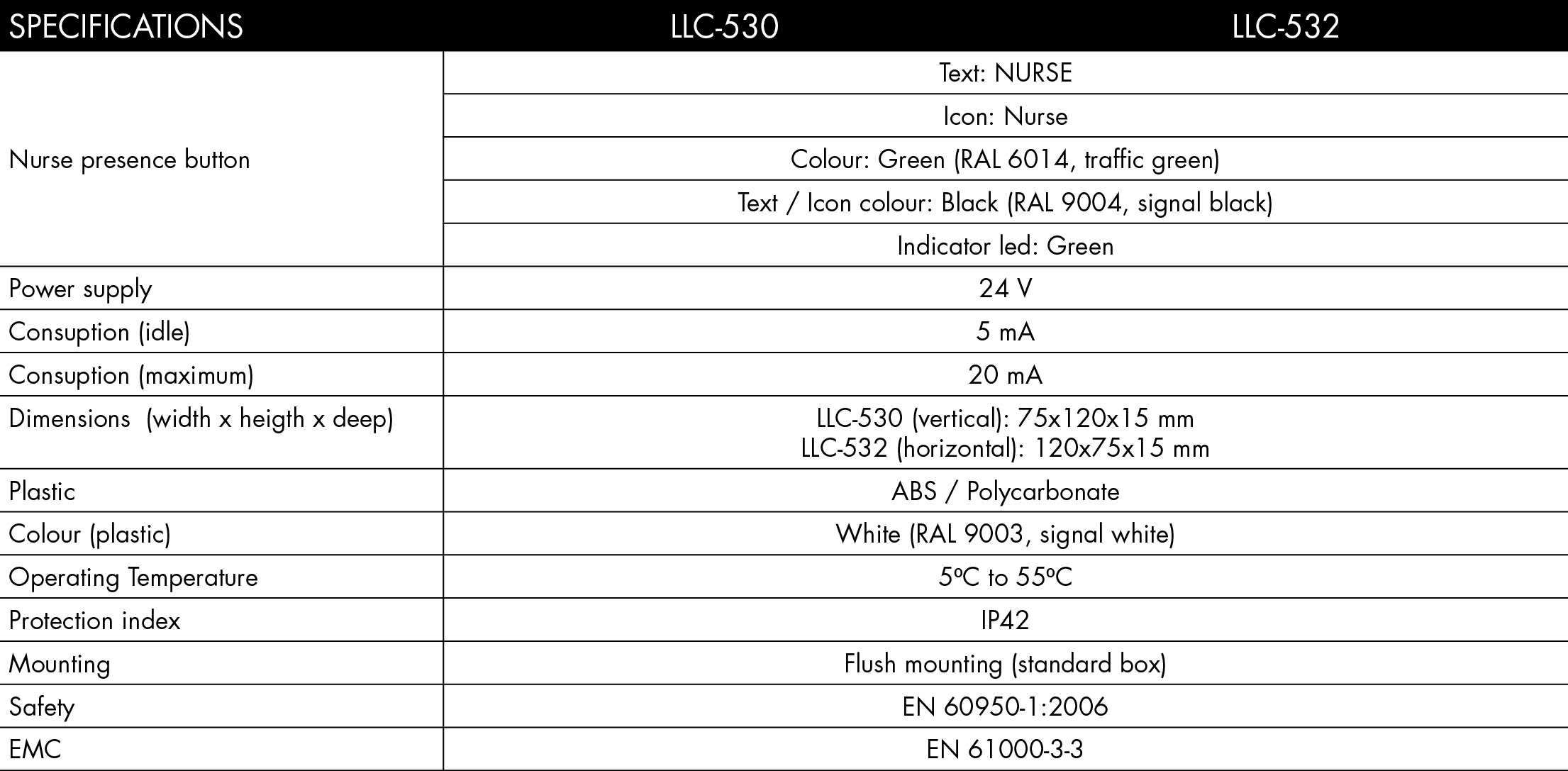 Room peripheral with nurse presence push-button with green LED indicator. It allows the nurse indicating that is in the room and thereby cancelling existing active call in the room. When the nurse presses the button the green LED indicator stands steady ON until the presence finishes pressing the button again. Easy to clean antimicrobial cover. Flush mounting.