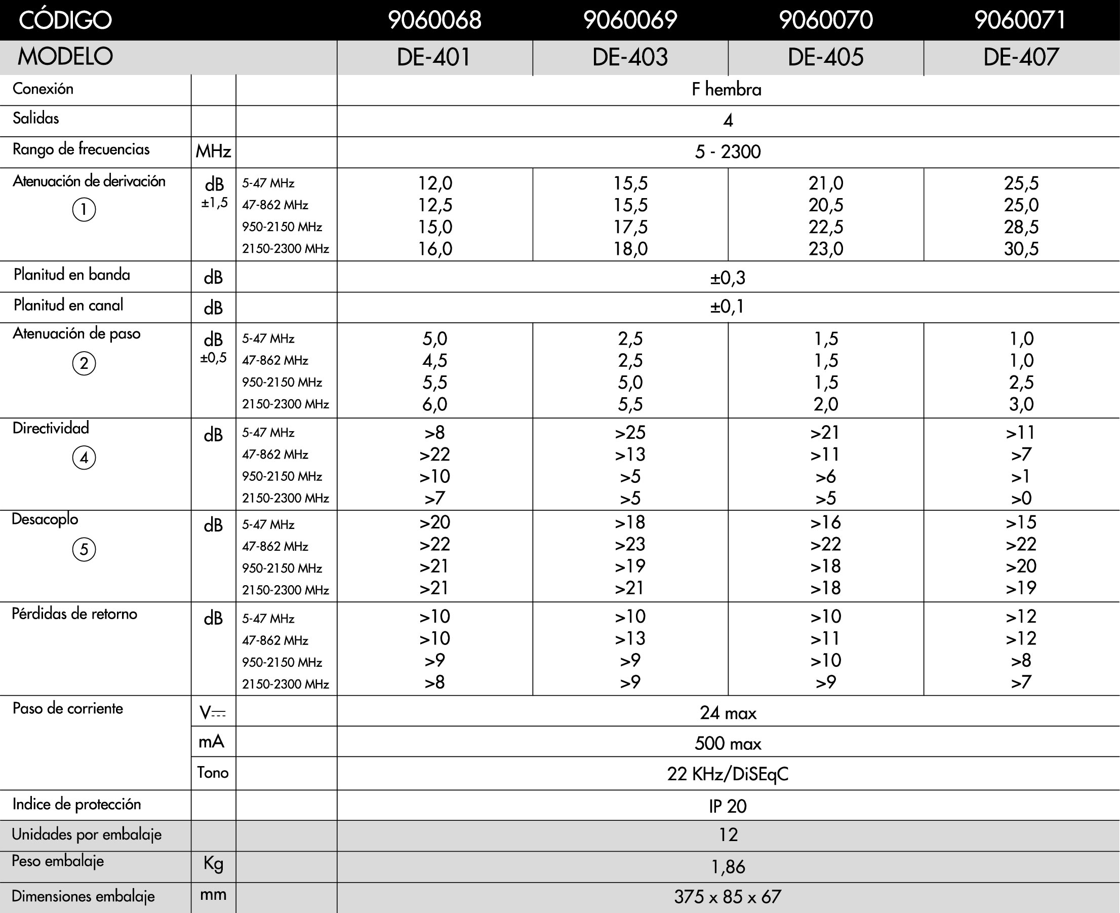 Derivadores para TV terrestre y satélite con cuatro salidas derivadas, que cubren las frecuencias de 5 a 2.300 MHz. Derivan parte de la señal de entrada a sus salidas derivadas, continuando la mayor parte de la señal hacia la salida. La respuesta de las salidas derivadas es plana, sin ecualización. Disponibles en diferentes valores de atenuación de derivación.