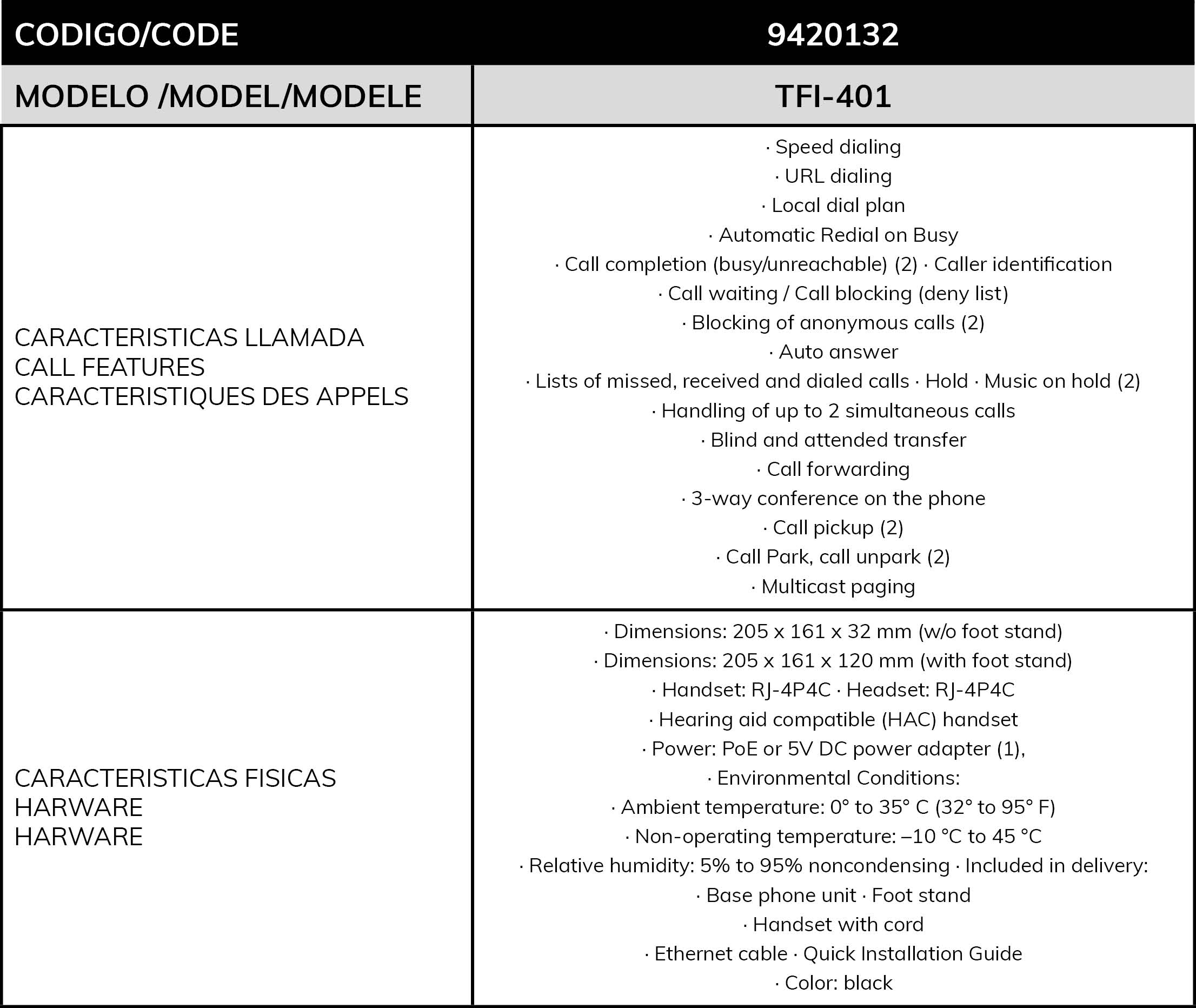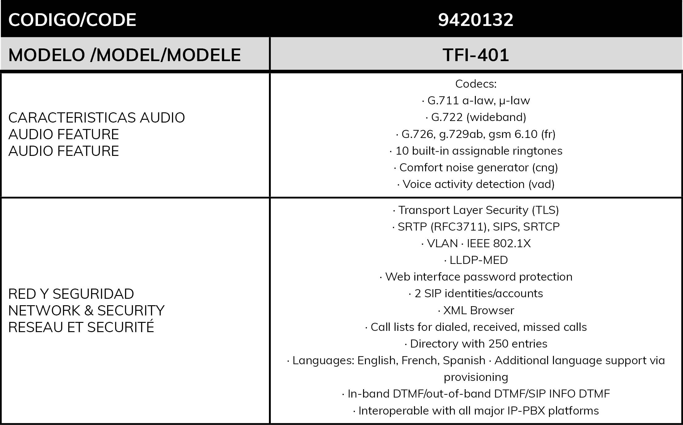 El TFI-401 es el nuevo referente de los teléfonos IP básicos para ACCURO y LIVERO. Equipado con una pantalla gráfica retroiluminada en blanco y negro, el teléfono TFI-401 ofrece una visibilidad extraordinaria de toda la información con las alarmas de nuestros sistemas.