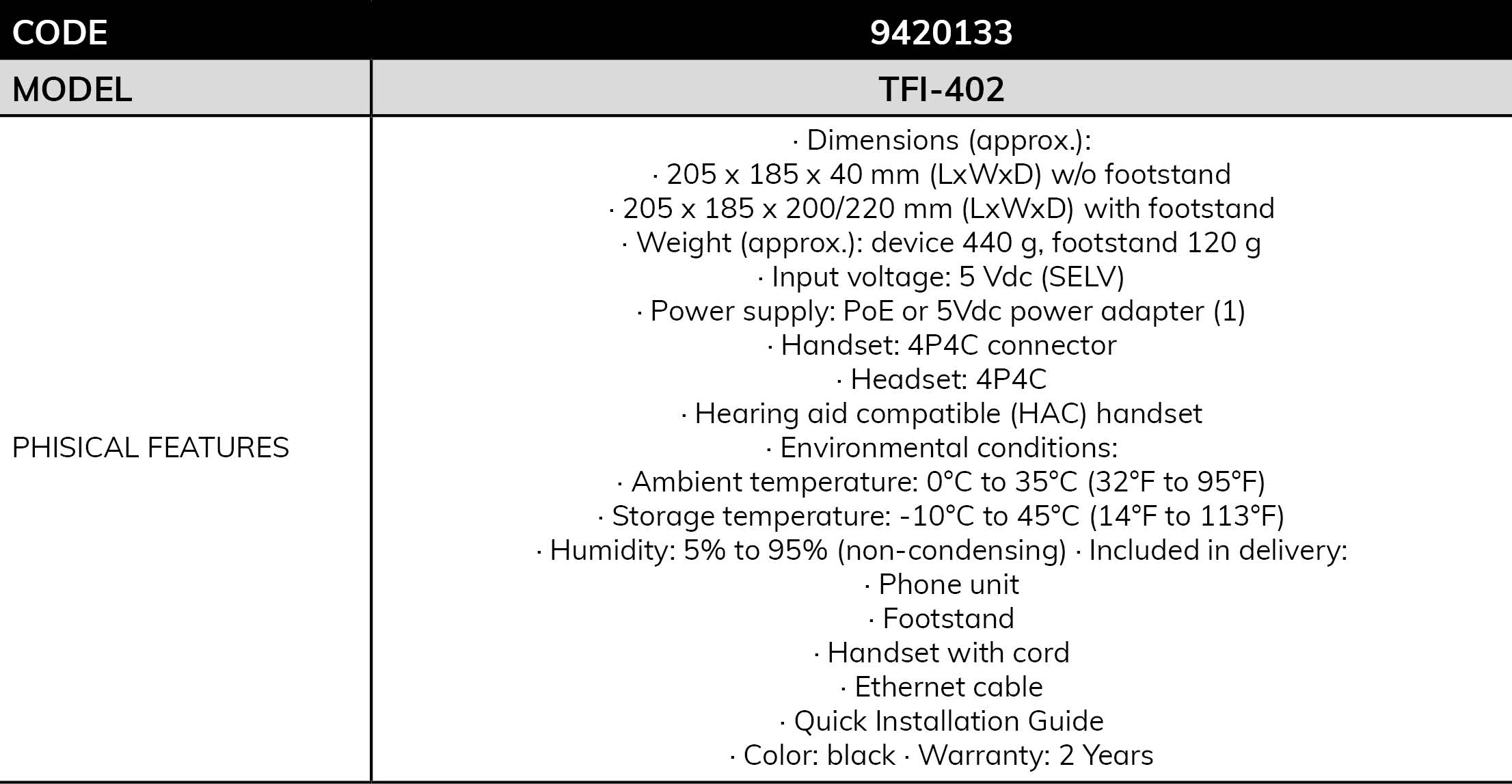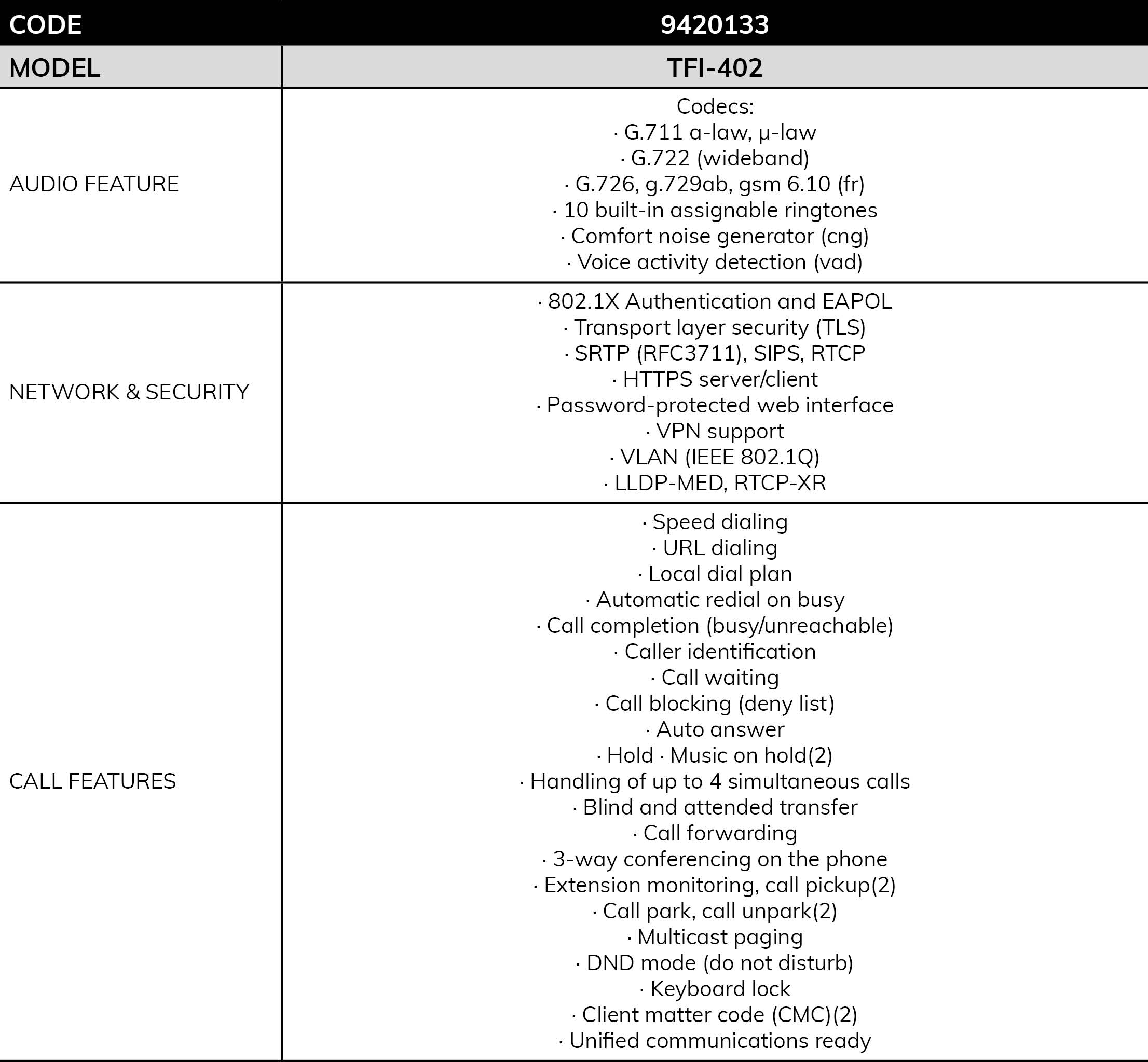 El TFI-402 es un teléfono de escritorio IP de última generación con todas las funciones para implementaciones de pequeña o gran escala adecuadas para su uso en una multitud de escenarios empresariales. Al admitir cuatro líneas SIP y cinco teclas programables con LED integrados para alertas visuales de indicación de llamadas, el TFI-402 combina un diseño útil y elegante para una alto uso con alto rendimiento y asequibilidad.