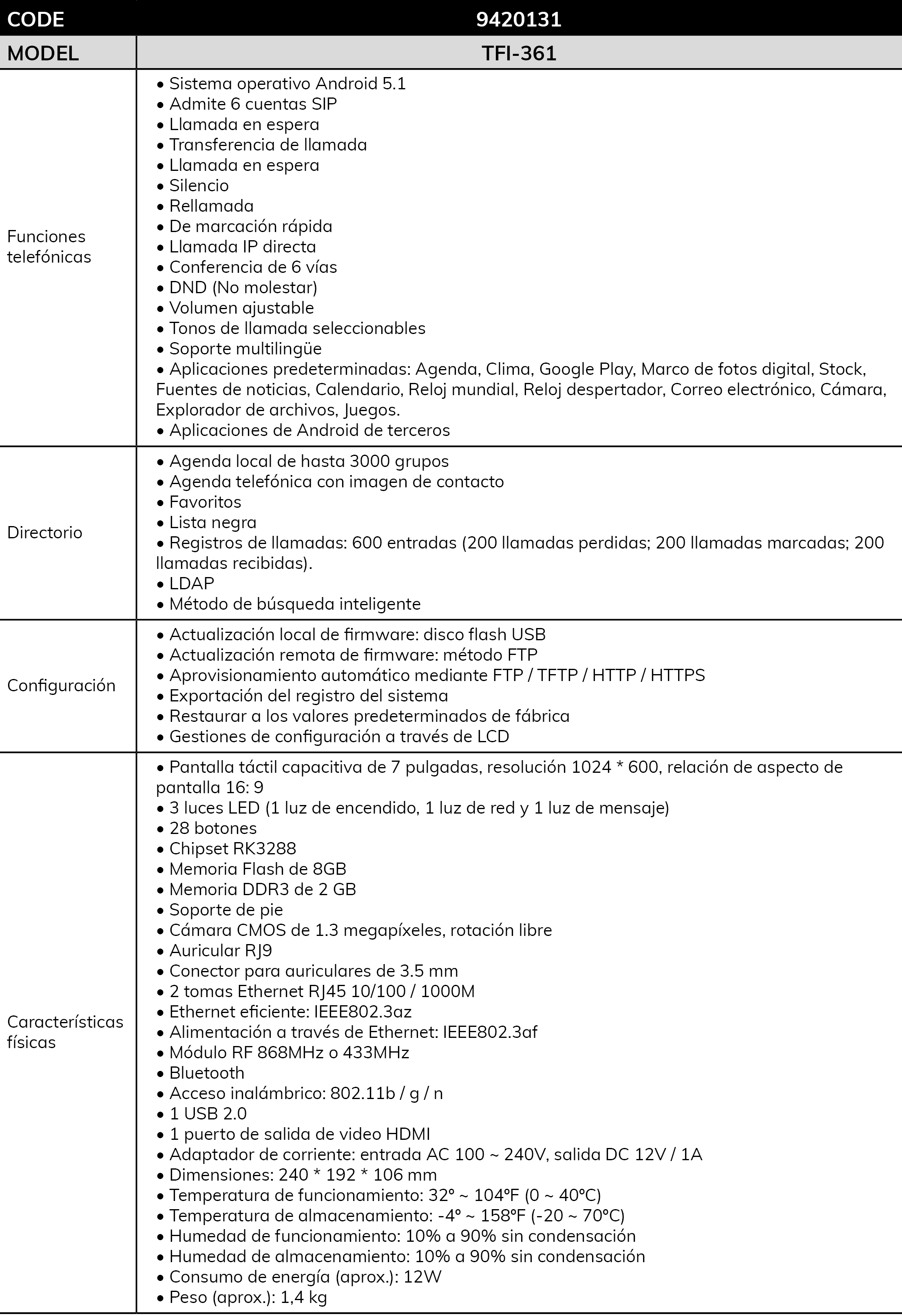 El TFI-361 es un terminal multimedia basado en Android con una pantalla táctil de 7 pulgadas y una cámara con sensor CMOS de 1.3Mpx. Admite códecs H.264 / H.263 con ajuste adaptativo de ancho de banda. La pantalla táctil de 7 ''ofrece excelentes experiencias de usuario, como video conferencia de alta calidad, navegación fluida por Internet, diversas aplicaciones de Android e información diaria.