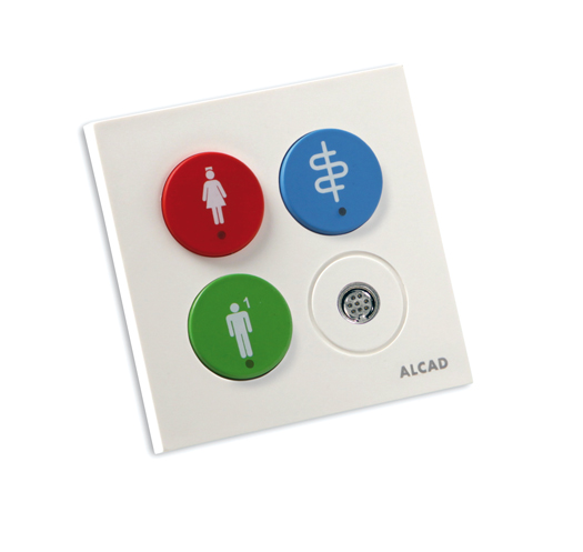 Tirador de baño versión táctil antibacteriana para montaje en caja universal, con cordón de 2m de largo, botón de llamada roja, y luz indicadora de marca ALCAD. Consiste en: