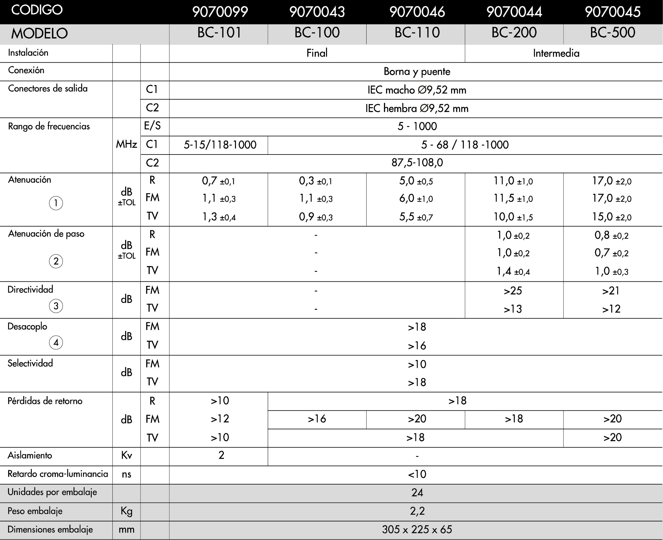 Bases de toma para TV terrestre con dos conectores IEC macho y hembra. Salidas para radio y TV separadas con filtros. Diseñadas para su uso en redes de TV por cable. Cubren las frecuencias de 5 a 1000 MHz.