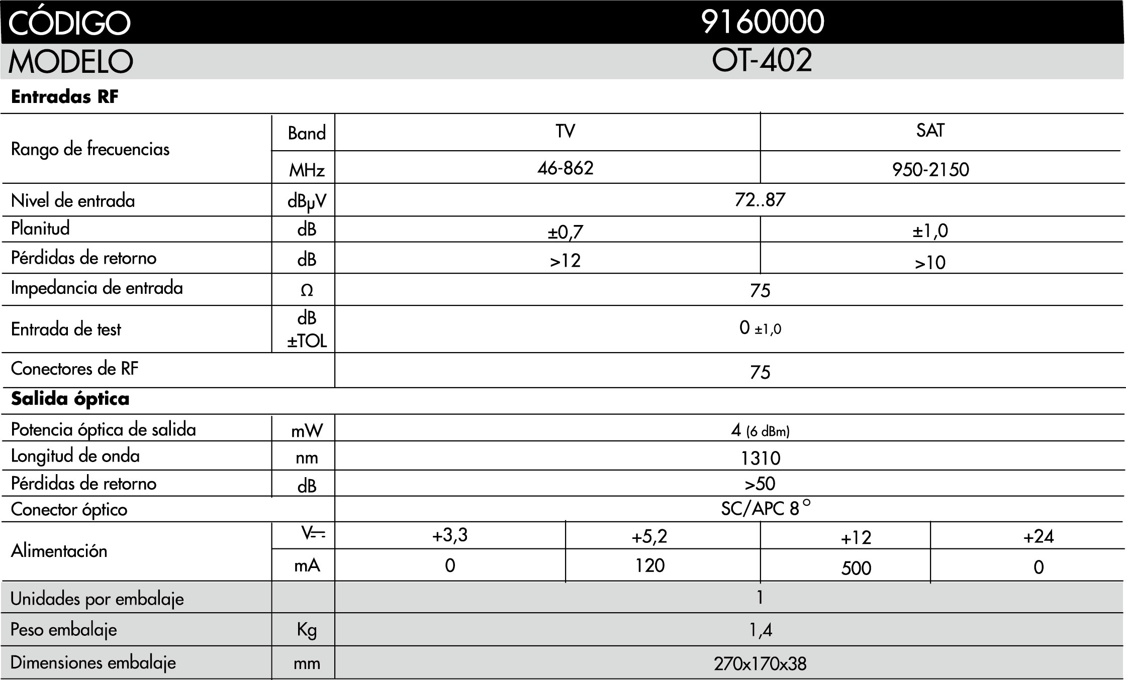 Transmisor óptico para señales de TV analógicas y digitales en terrestre y satélite. El equipo recibe las señales de TV en banda terrestre en y satélite en FI mediante cable coaxial, y las transmite mediante fibra óptica monomodo con una longitud de onda ( ) de 1310 nm, mediante láser de Clase 1.
