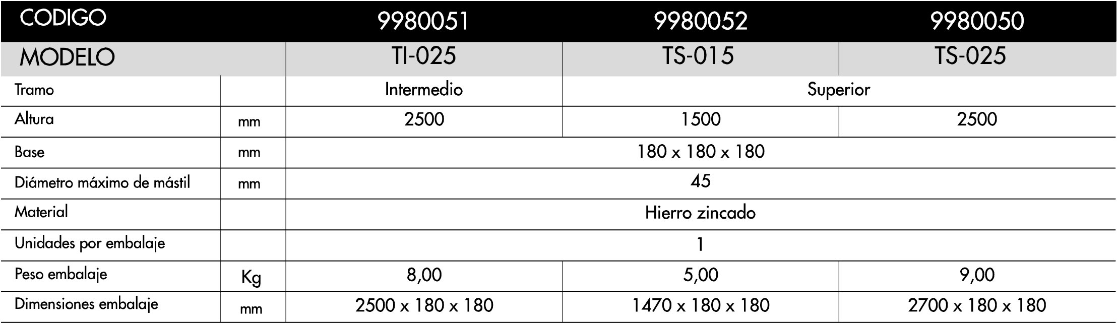 Torreta de perfil triangular de 180mm de lado, formada por varias secciones intermedias y una sección superior sobre la que se fija un mástil de antena. La torreta se fija al tejado o suelo mediante una base de torreta que se puede empotrar o fijar con tacos metálicos. La base abatible permite abatir la torreta para operaciones de mantenimiento.