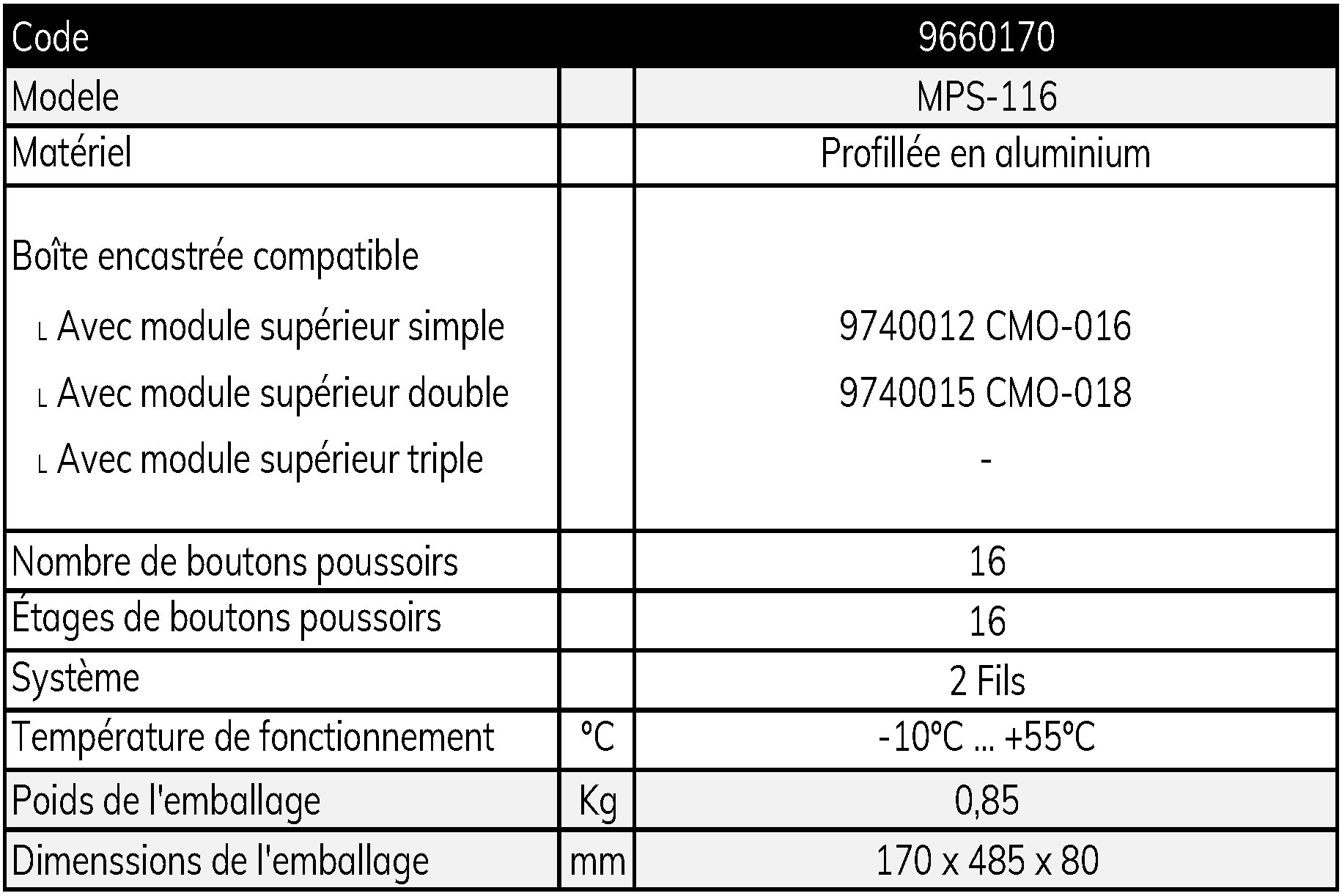Disponible en format modulaire, avec modules supérieurs et inférieurs. Le module supérieur peut être simple, double ou triple. Le module inférieur est disponible avec des boutons-poussoirs simples ou doubles. Profillée en aluminium.