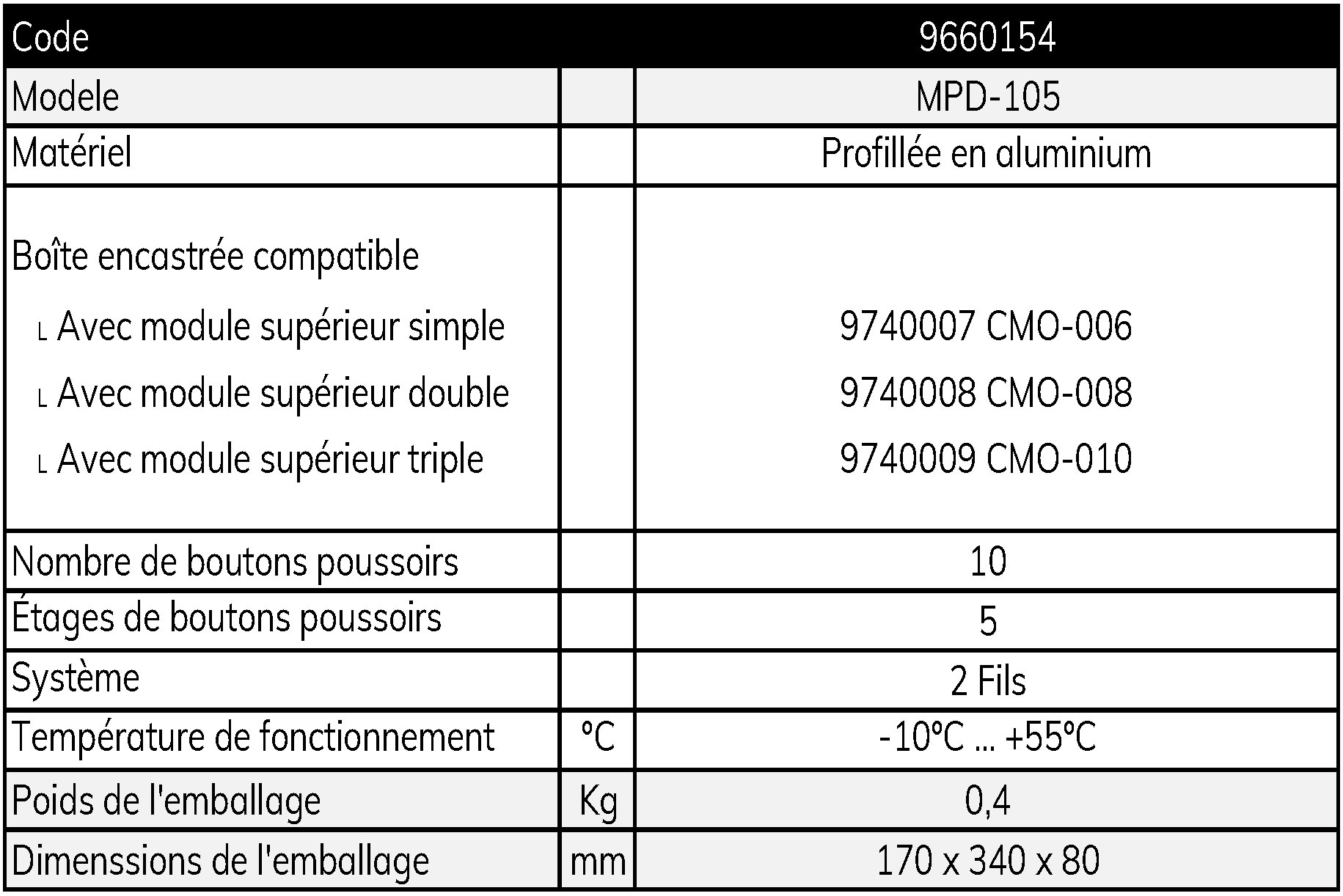 Disponible en format modulaire, avec modules supérieurs et inférieurs. Le module supérieur peut être simple, double ou triple. Le module inférieur est disponible avec des boutons-poussoirs simples ou doubles. Profillée en aluminium.
