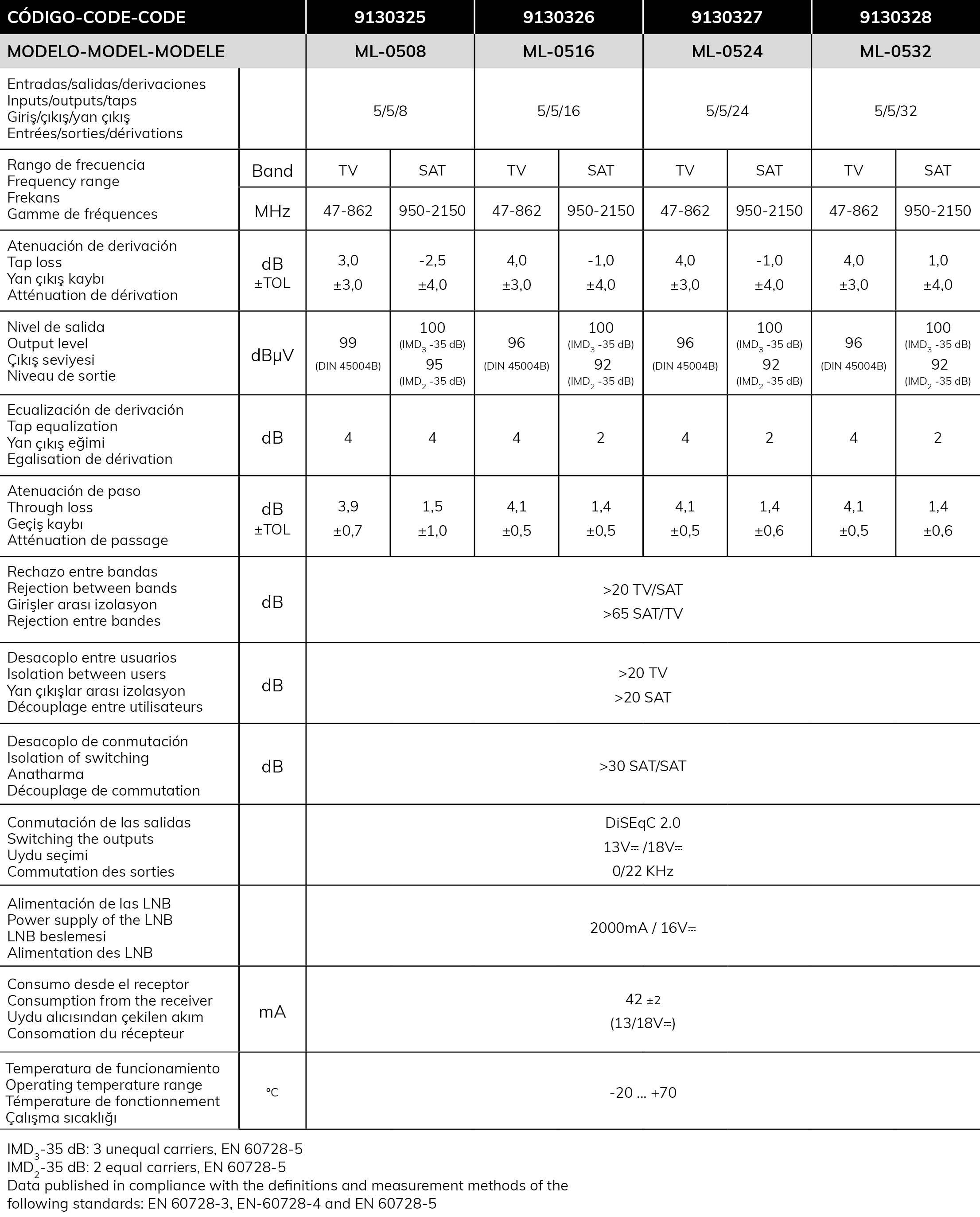 Installations collectives de télévision par satellite et terrestre de taille moyenne. Il est essentiel qu'ils soient montés avec des multocommutateurs d'extrémité, de manière à obtenir des distributions de jusqu'à 64 sorties sur une seule ligne si elles sont installées avec des amplificateurs intermédiaires.