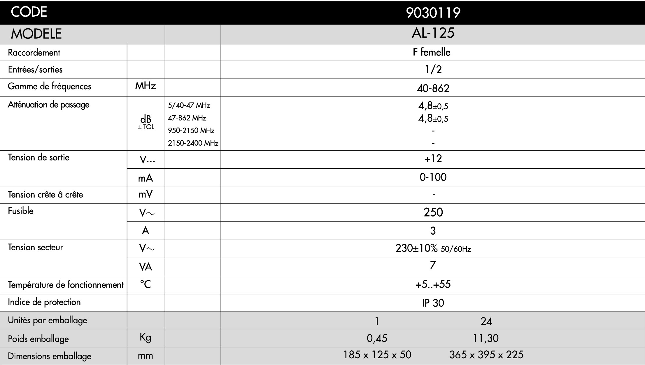 Châssis zamak blindé, recouvert d'une boîte en plastique ABS pour usage extérieur. Bloc d'alimentation isolé du circuit haute fréquence, conforme aux normes de sécurité pour l'installateur et l'utilisateur. Fixé au mur à l'aide de chevilles et de vis fournies. Connecteurs de type F Fourni en paquets individuels ou multiples.