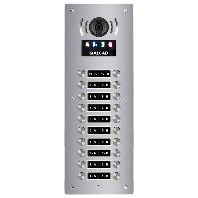 Plaque de rue anti-vandalisme pour installations d'interphone vidéo à 2 fils. Il comprend le module principal EVG-000, le même que celui utilisé par la plaque de rue USOA. Cette plaque dispose de 20 boutons d'appel ordonnée en 2 colonnes.
