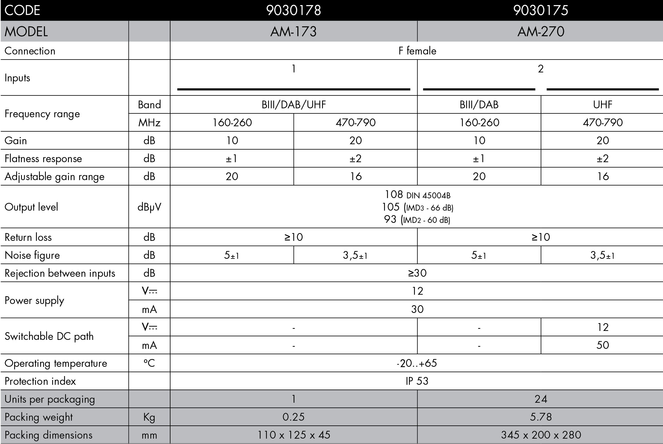 Amplificateurs à large bande pour mâts, compatibles avec le téléphone mobile LTE signaux avec bande d'amplification en UHF 470-790 MHz. Inclut un filtre de rejet pour supprimer les signaux LTE. Ils ont une ou deux entrées pour amplifier et combiner les signaux des antennes. Ils sont alimentés par le câble coaxial à partir d'une unité d'alimentation installée à l'intérieur du bâtiment. Ils intègrent un chemin DC commutable, permettant d'alimenter un préamplificateur.