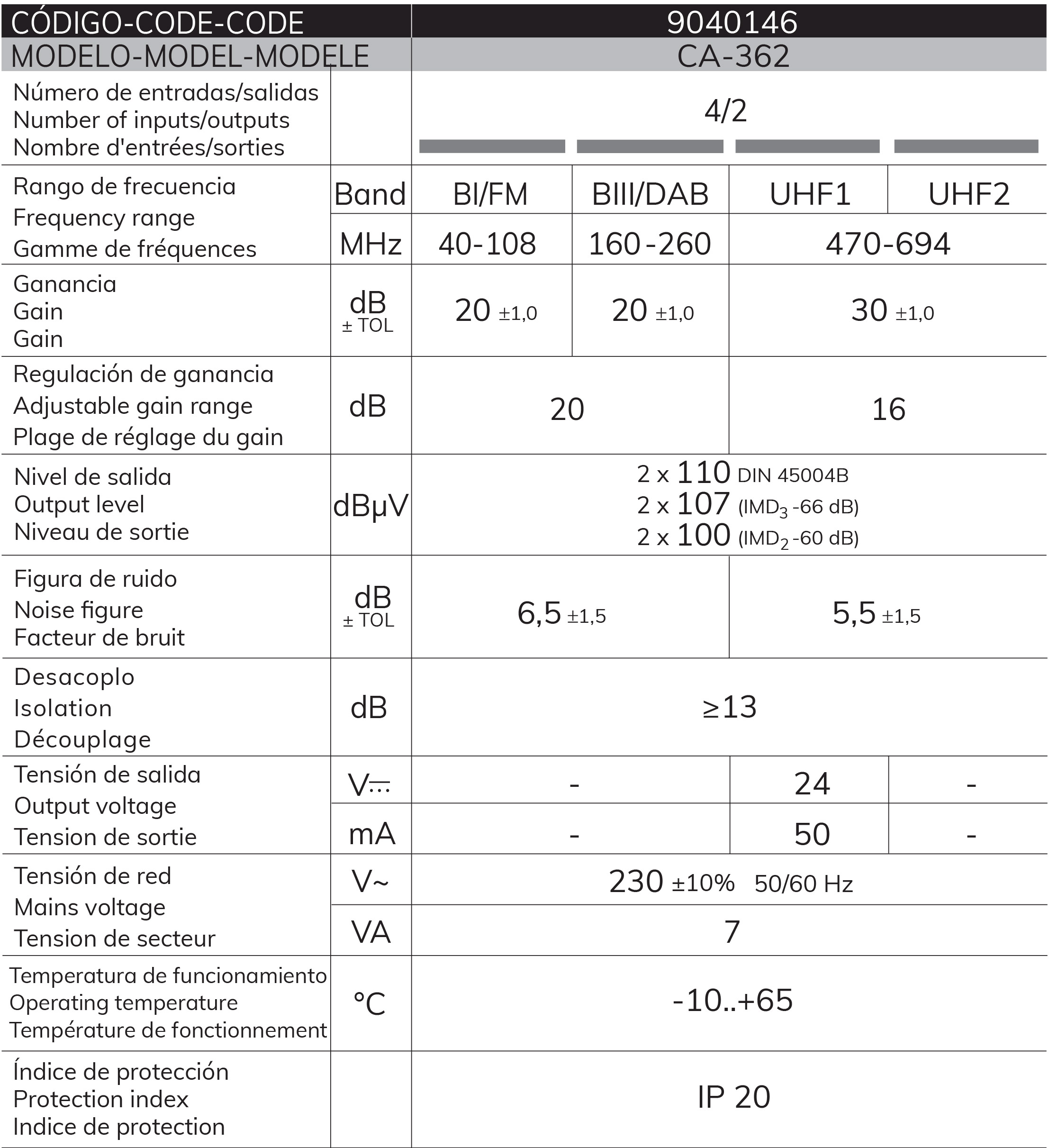 Fabriqué en plastique ABS, avec un châssis zamak interne qui offre un blindage maximal. Connecteurs de type F qui permettent une connexion avec un minimum de désadaptation et un blindage élevé. Bloc d'alimentation isolé du reste du circuit haute fréquence, conforme à toutes les normes de sécurité. Connecteurs de type F à visser ou à sertir.