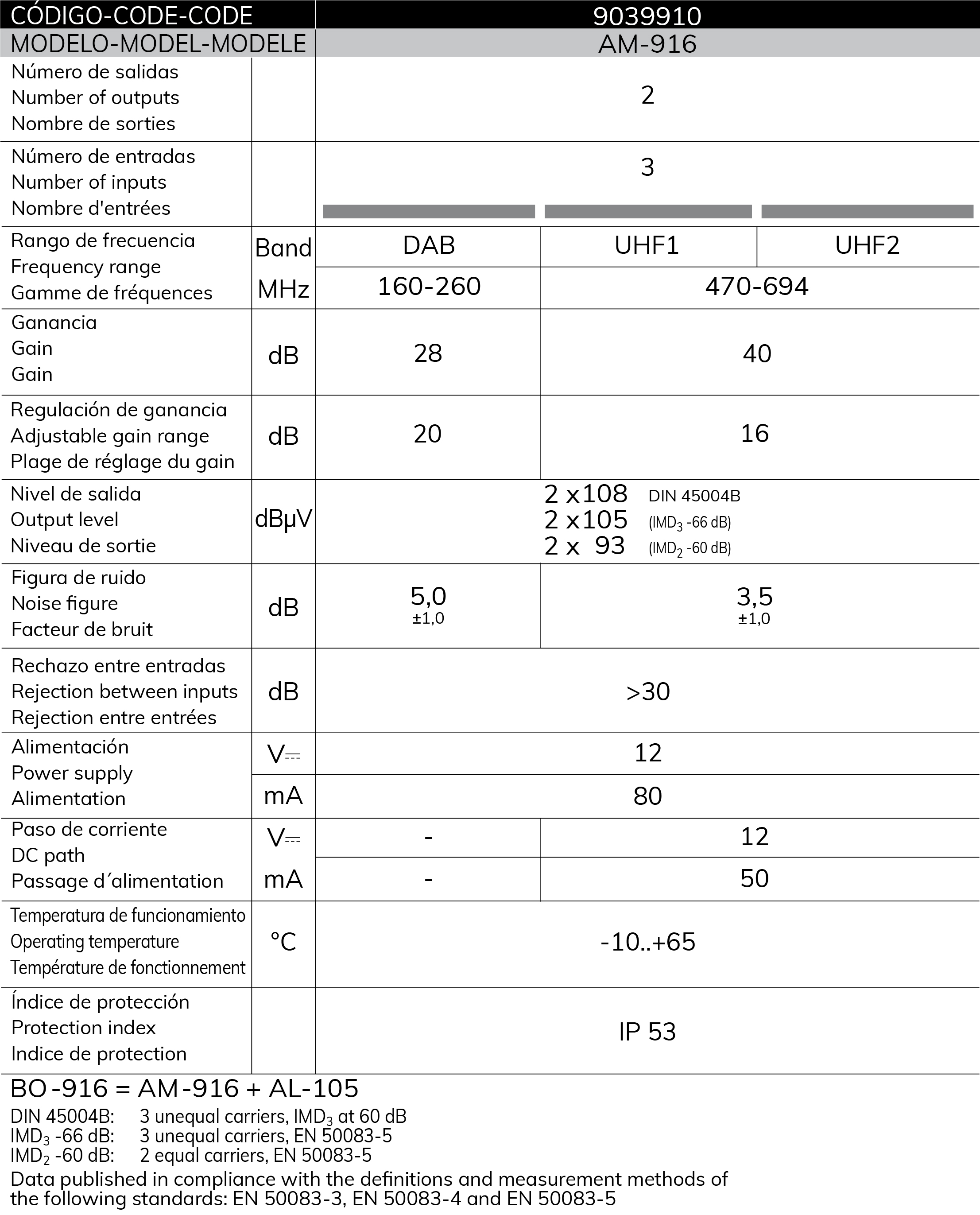 Amplificateurs à bande large pour mâts, compatibles avec les signaux de téléphonie mobile LTE800 et LTE700 avec bande d'amplification en UHF 470-694 MHz. Ils ont deux entrées pour amplifier et combiner les signaux des antennes. Ils ont deux sorties. Ils sont alimentés par le câble coaxial à partir d'une alimentation installée à l'intérieur du bâtiment. Ils intègrent un passage DC commutable, permettant d'alimenter un préamplificateur.
