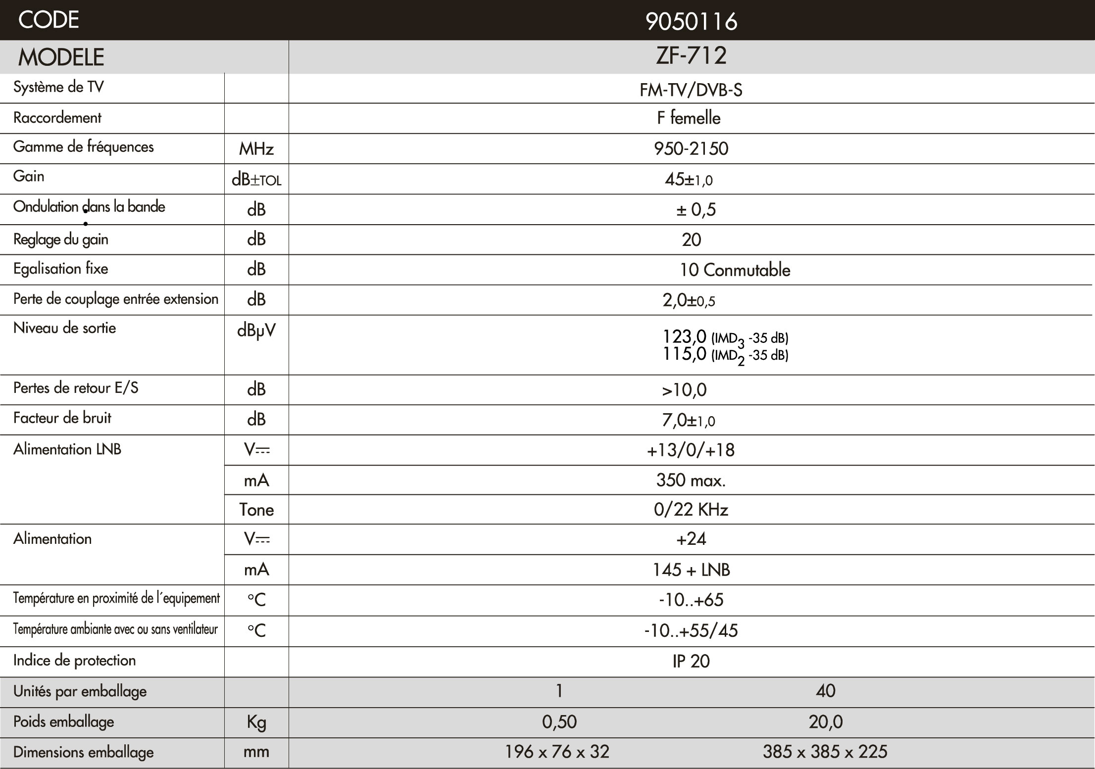 Amplificateur IF large bande pour une polarité qui amplifie la bande IF d'un LNB et mélange le signal TV terrestre provenant du reste de l'équipement. Il alimente le LNB avec la tension d'alimentation et le signal de 22 KHz requis pour obtenir la polarité désirée.