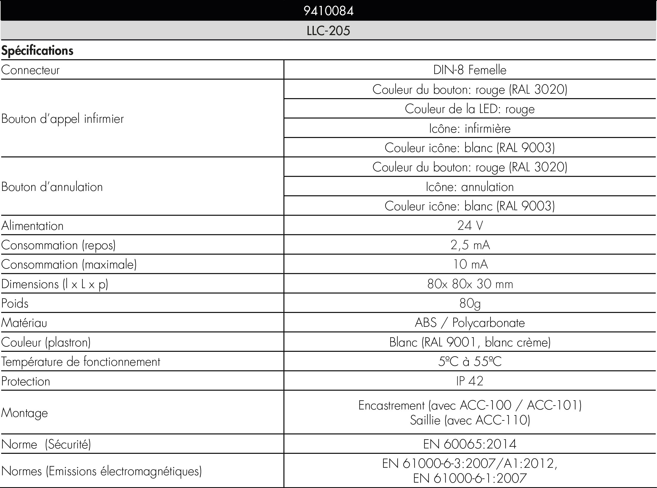 Périphérique de chambre avec connecteur pour une poire dappel (LLC-21x), bouton dappel à linfirmier avec une Led indicatrice rouge et bouton dannulation. Permet de lancer un appel depuis la poire dappel connectée (LLC-21x) ou depuis le bouton dappel rouge. Une fois lappel lancé, le voyant rouge permet didentifier facilement lendroit doù lappel a été lancé. Il permet lannulation de lappel lancé via le bouton Annuler. En saillie ou encastré.