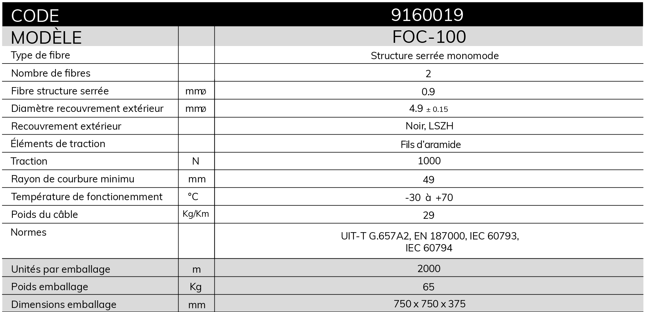 Câble d'abonné de 2 fibres optiques monomode à structure serrée pour installation extérieure type G.657A2. Recouvrement extérieur LSZH de couleur noir. Câble monotube interne pour protéger les 2 fibres optiques. Haute protection contre les tractions et les torsions grâce à son recouvrement interne avec fils d'aramide. Y compris un fils interne de renforcement en nylon pour faciliter l'installation.