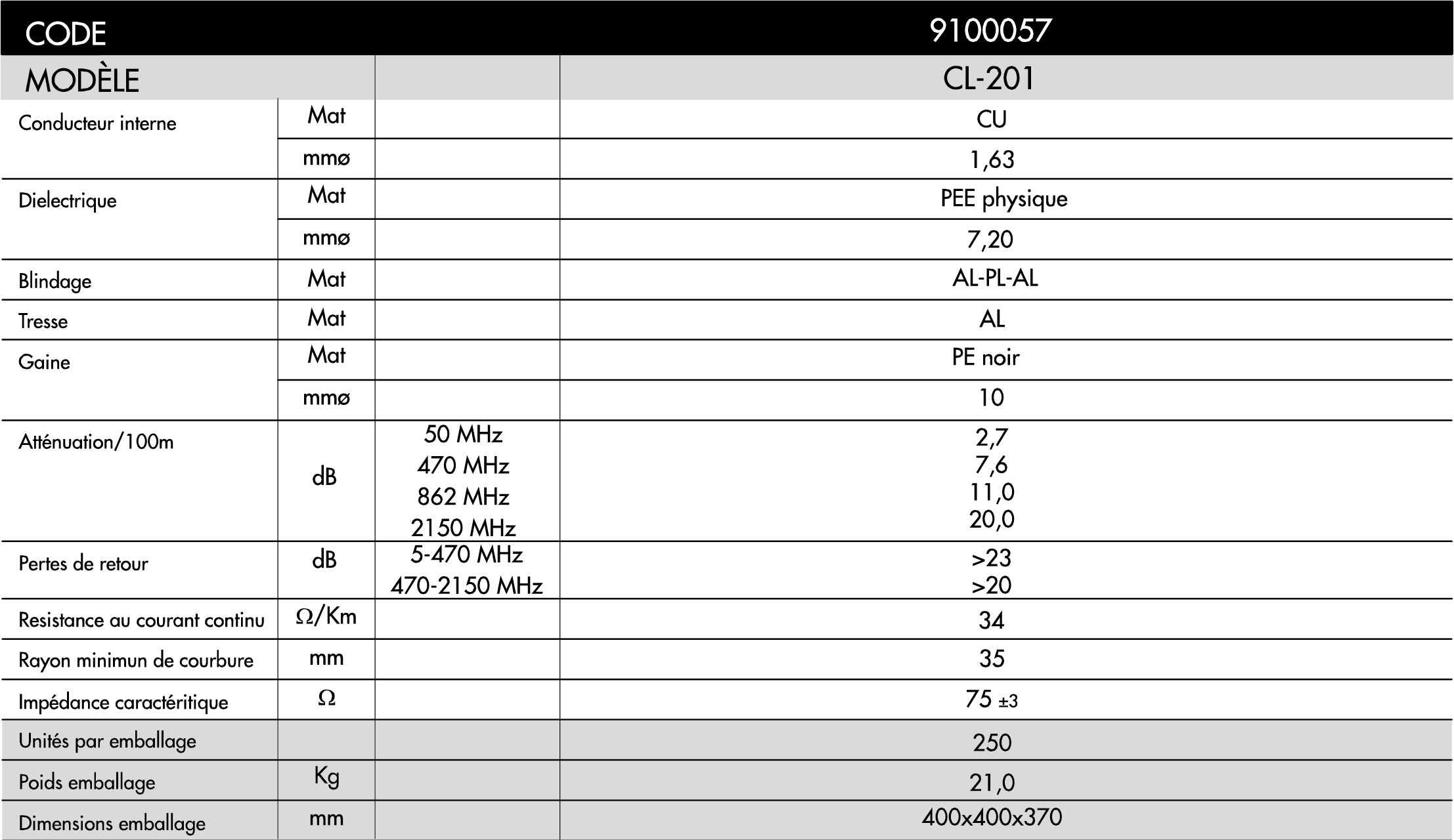 Câble coaxial RG-11 avec diélectrique physiquement expansé. Ignifuge. Conforme à la norme EN 50117.
