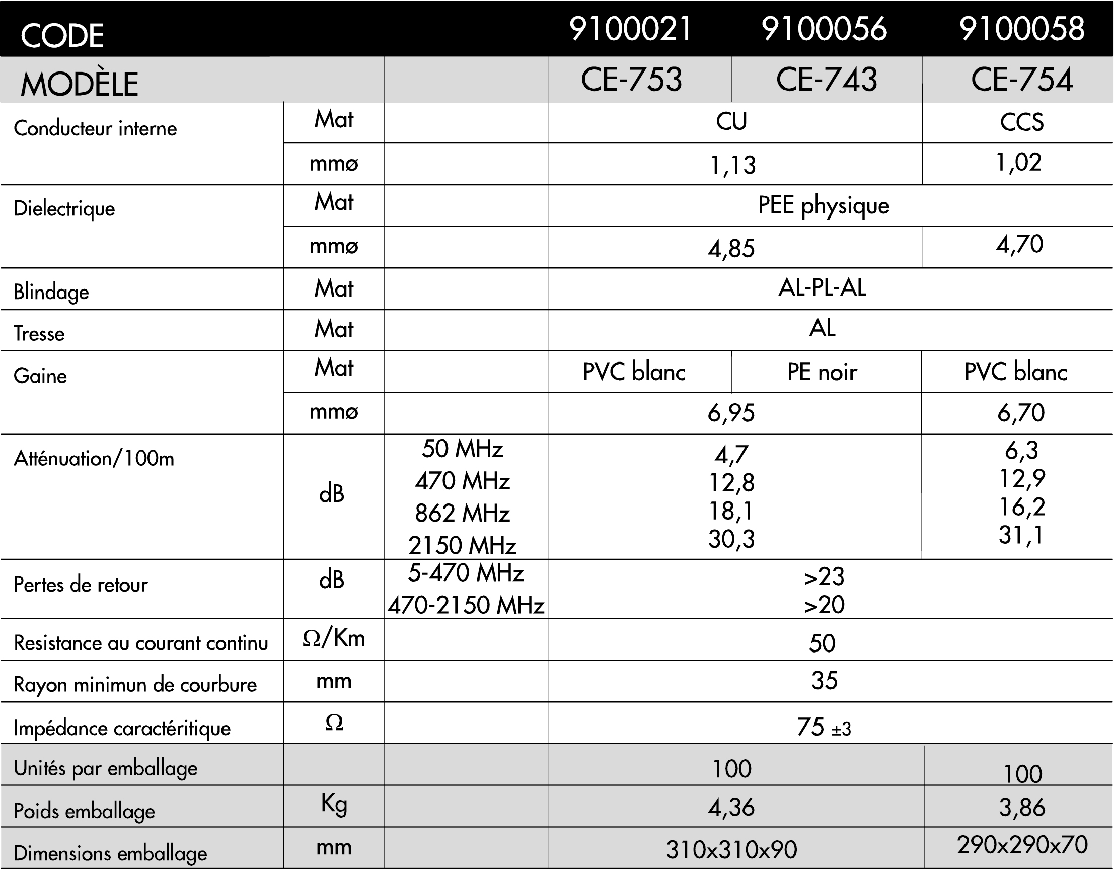 Câble coaxial avec diélectrique physiquement expansé. Ignifuge. Conforme à la norme EN 50117.