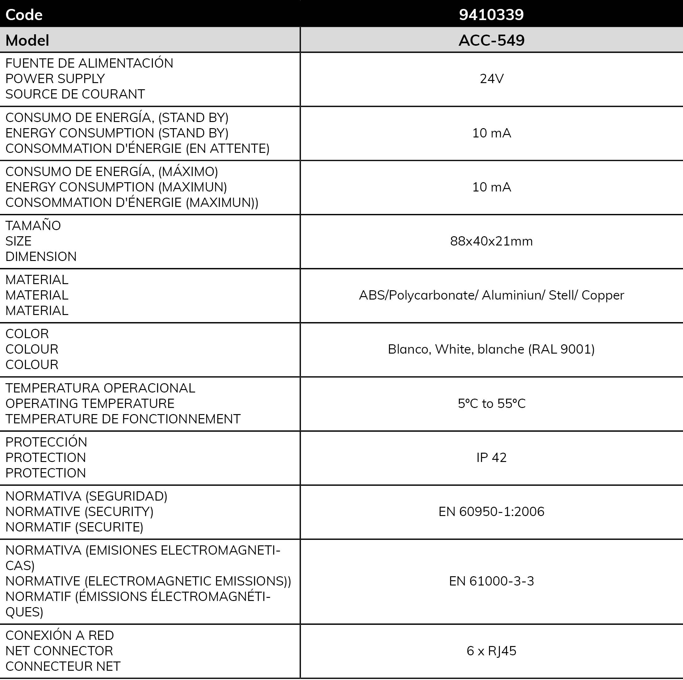 L´ accessoire ACC-549 est un concentrateur/ distributeur pour de périphériques intelligents en bus avec une connexion en borne métallique RJ45. Elle contient 1 entré, 1 sortie et 4 dérivations.