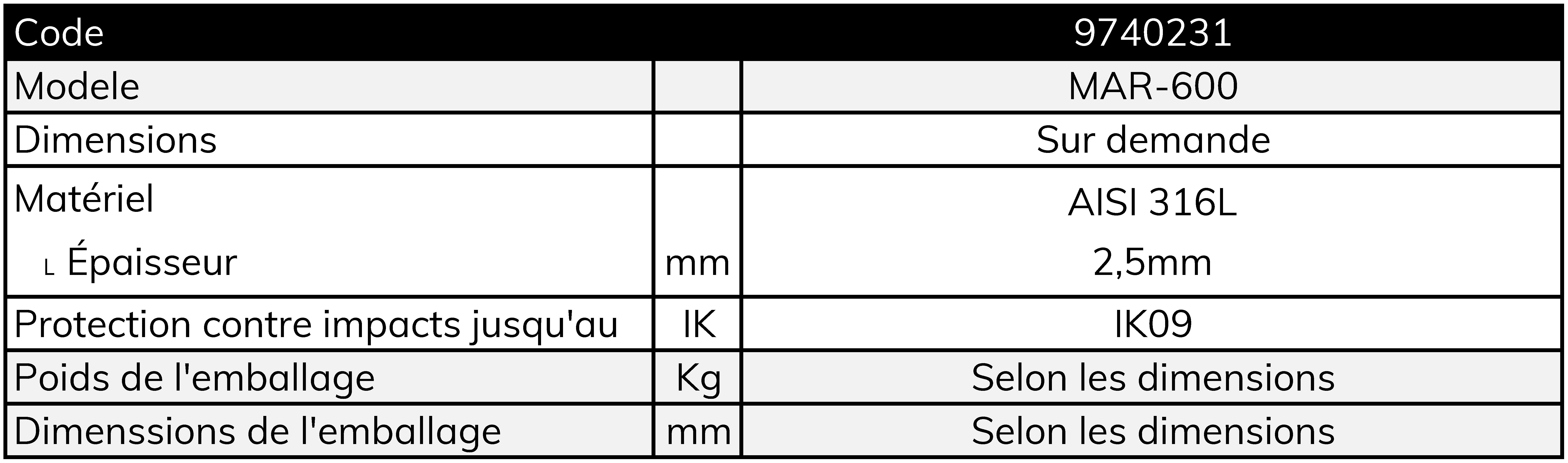 Très utile pour des remplacements quand la plaque de rue à remplacer est plus grande que la nouvelle plaque de rue ou dans les installations où la surface du mur est irrégulière. Construction en acier inoxydable AISI 316L avec une épaisseur de 2,5 mm. Protection contre les impacts et impacts jusqu'au grade IK09.
