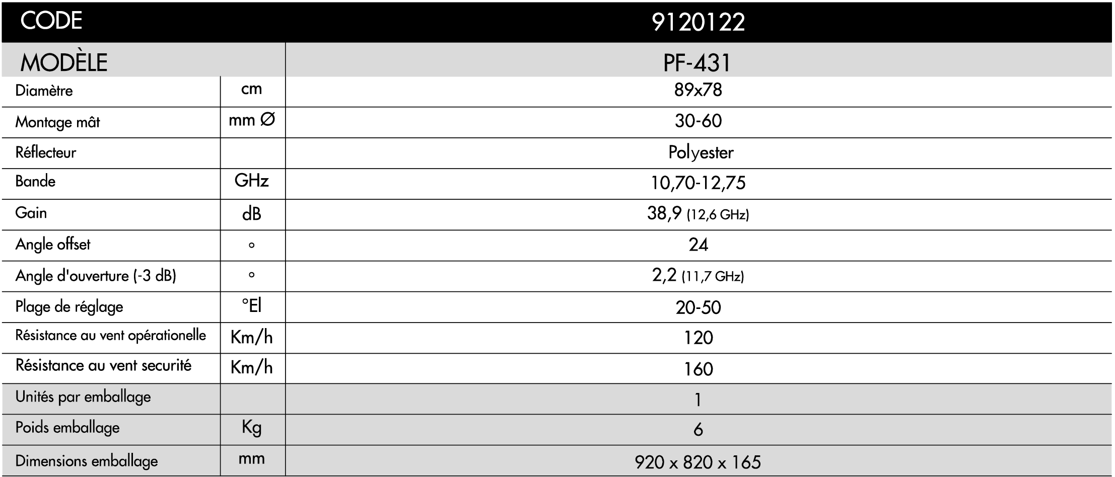 Antenne parabolique offset en fibre de verre avec gain élevé et efficacité. L'assemblage de l'antenne est simple, une fois installé il est très robuste et assure une grande stabilité d'orientation. L'emballagé comprend des éléments qui évitent d'endommager le réflecteur pendant le transport.