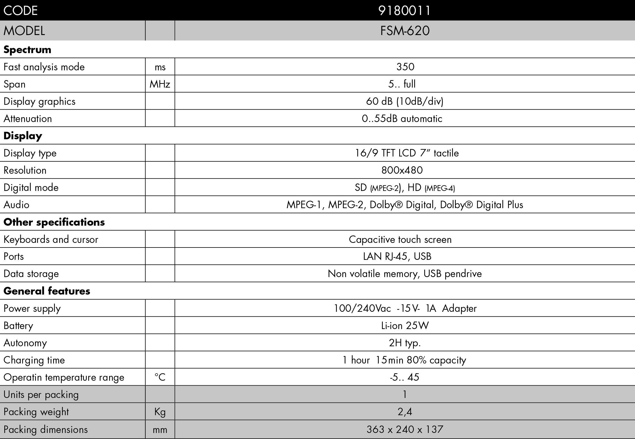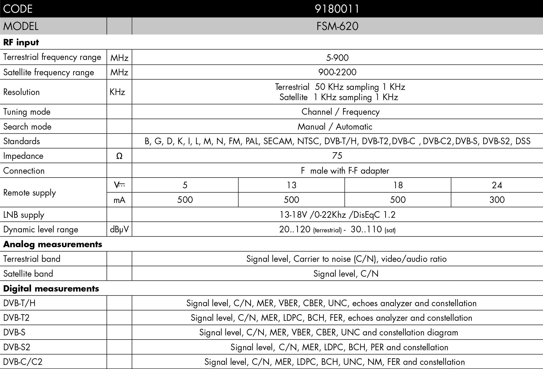 Mesure et analyse des installations de télévision terrestre, par satellite et par câble, fournissant les mesures nécessaires pour les signaux numériques DVB-T / H, DVB-T2, DVB-S, DVB-S2, DVB-C et DVB-C2, mesures analogiques en PAL, SECAM et NTSC. Interface graphique des mesures et pointage parabole. Analyse spectrale ultra-rapide Regarder des programmes TV en HD (MPEG-4 H.264). Il permet le stockage et le chargement des tuyaux, grâce à ses ports Ethernet et USB.