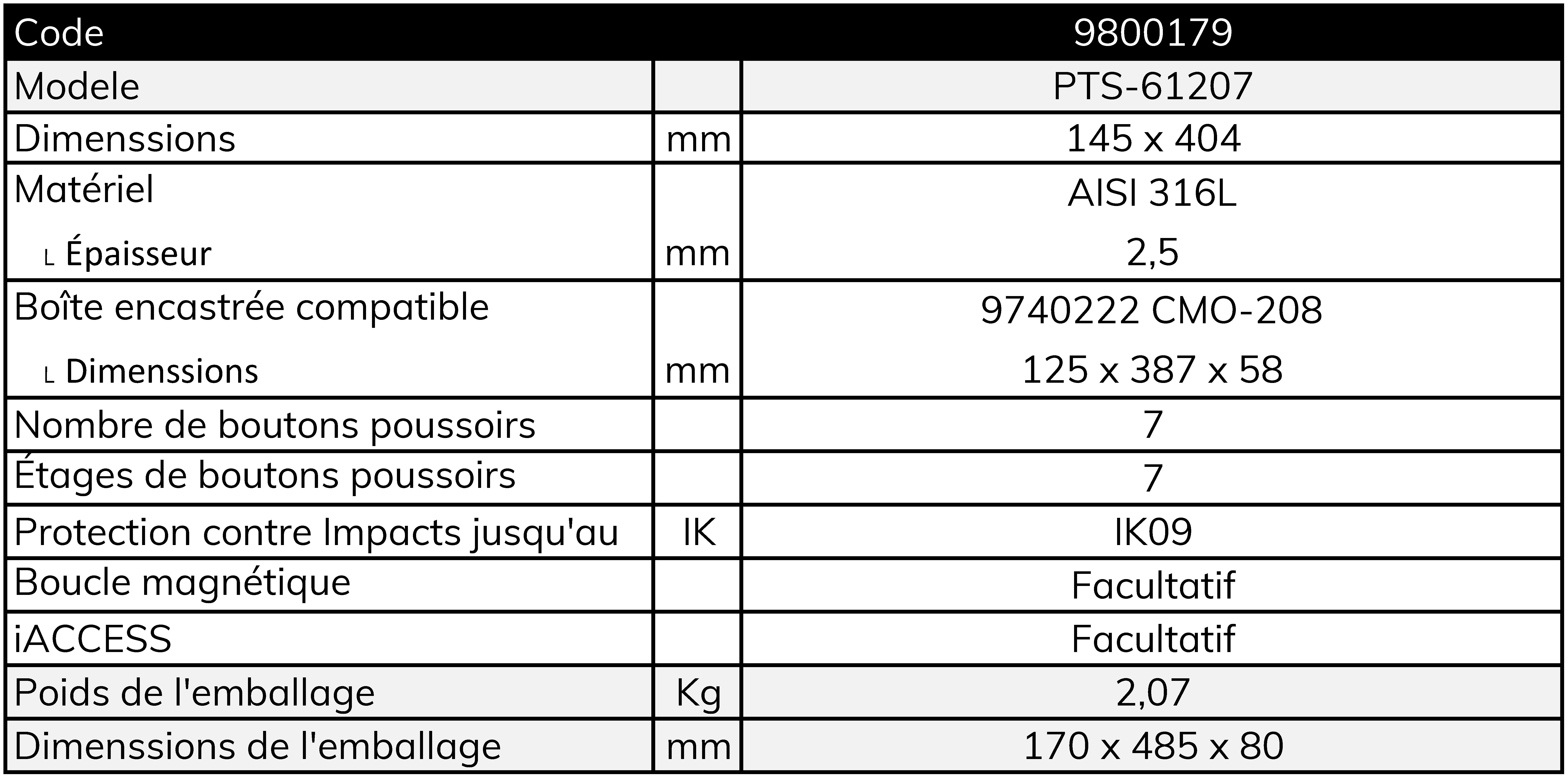 Panneau de rue anti-vandal pour les installations d'entrées vidéo à 2 fils. Comprend le module avec panneau d'etiquettes / iACCESS. Cette plaque dispose de 7 boutons d'appel positionnés en 1 colonne.