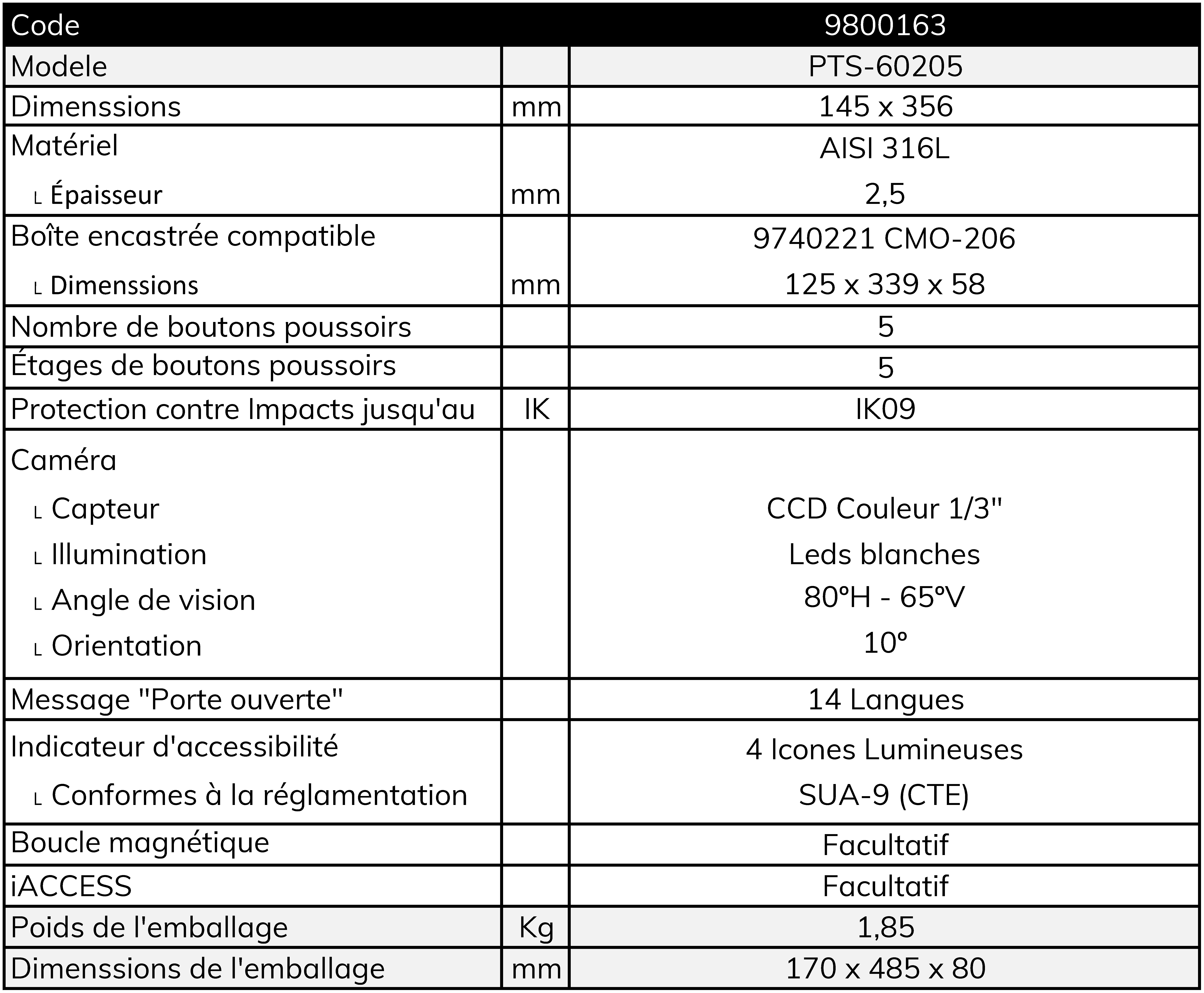 - Module d'accessibilité avec synthétiseur vocal avec 14 langues sélectionnables pour le message ''porte ouverte''. Cela inclut la possibilité de l'inhiber.