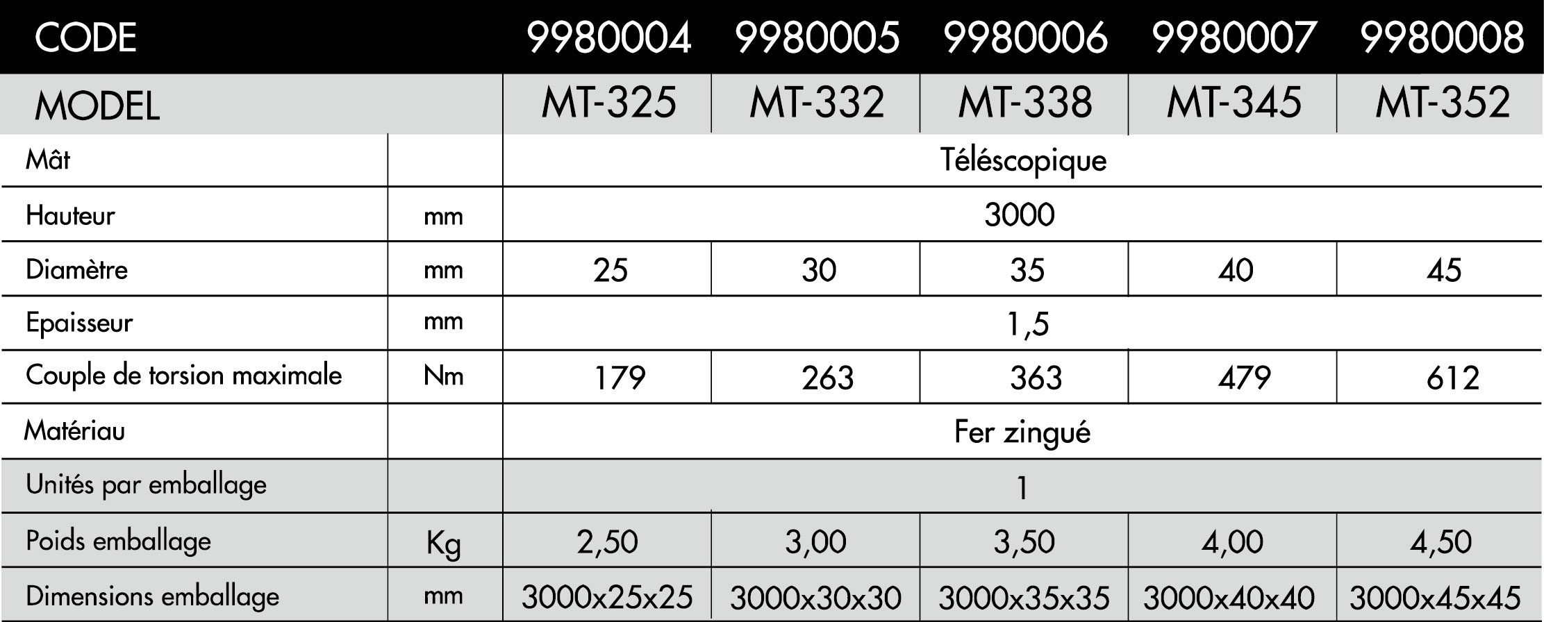 Fabriqué à partir de tube de fer rond galvanisé. Les différentes sections du mât sont assemblées en insérant la partie supérieure du mât dans la partie inférieure de l'autre section, en les fixant avec une vis M10 qui traverse les tubes