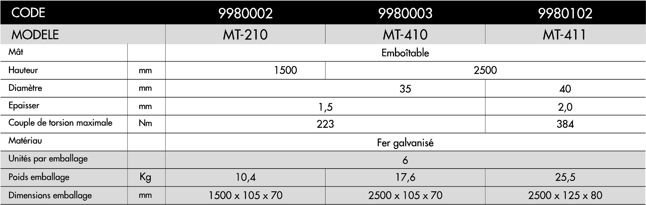 Fabriqué à partir de tube de fer rond galvanisé. Les différentes sections du mât sont assemblées en insérant la partie supérieure du mât dans la partie inférieure de l'autre section, en les fixant avec une vis M6 qui traverse les tubes