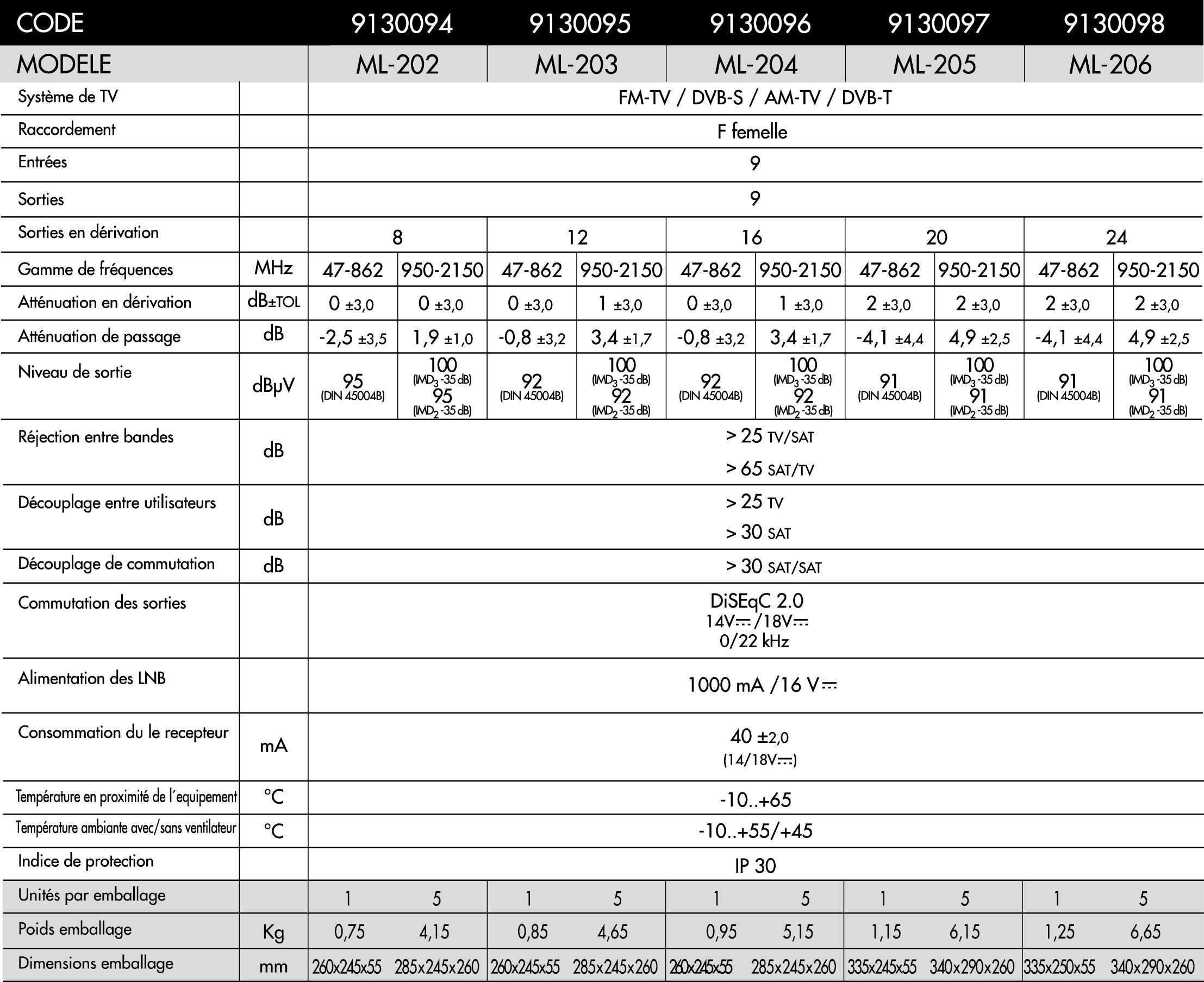 Multicommutateurs cascadables pour 8 polarités et TV terrestre avec 8, 12et 16 sorties. Les sorties sont amplifiées dans la bande FI du satellite. En bande terrestre, ils peuvent être configurés pour fonctionner en mode actif ou passif. il doit d'être alimenté à partir de chaque récepteur individuel de sorte que la commutation et l'amplification de chaque sortie de dérivation fonctionnera correctement.