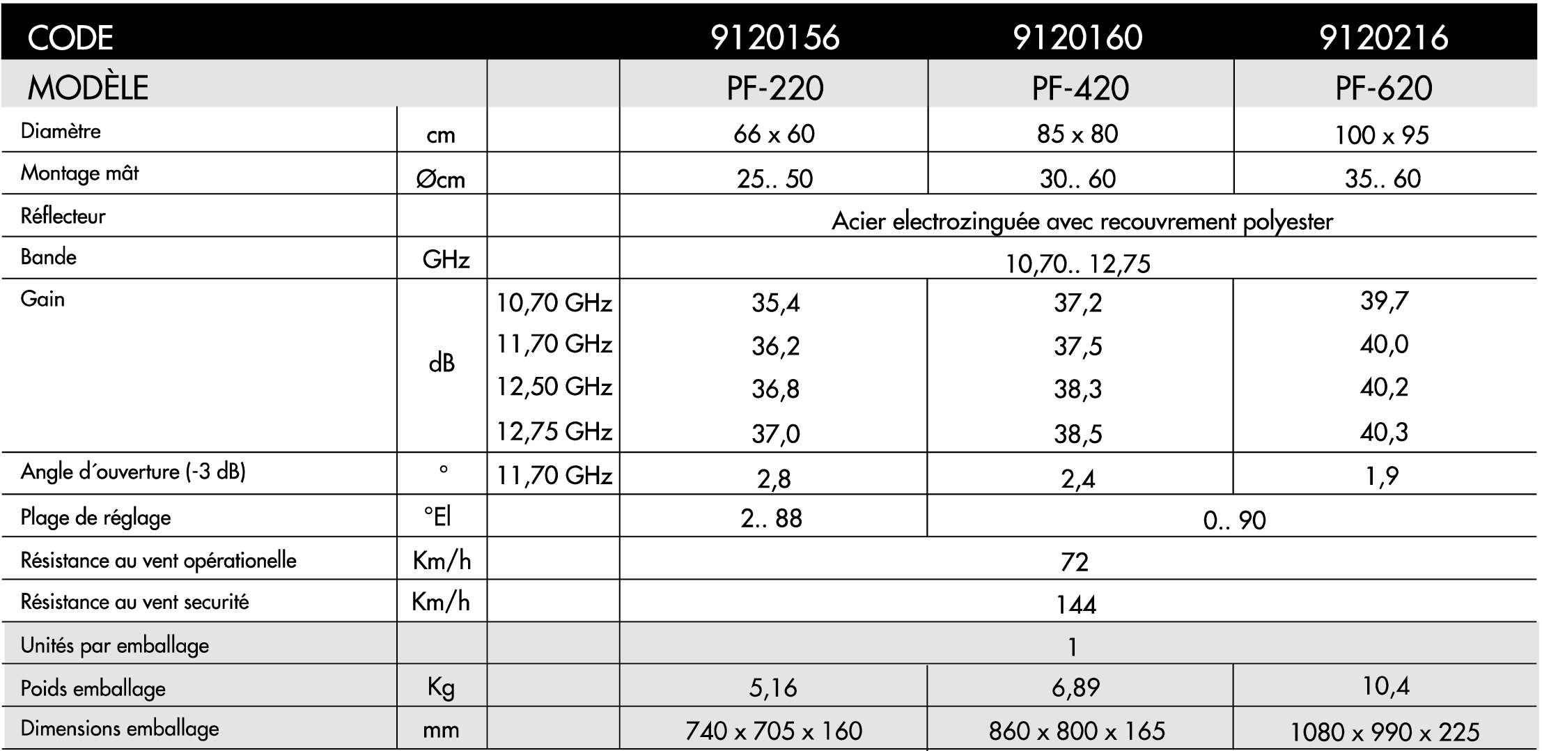 Antenne robuste avec une grande résistance au soleil et aux intempéries. Le réflecteur est en acier galvanisé revêtu d'époxy et les accessoires sont en fer galvanisé.