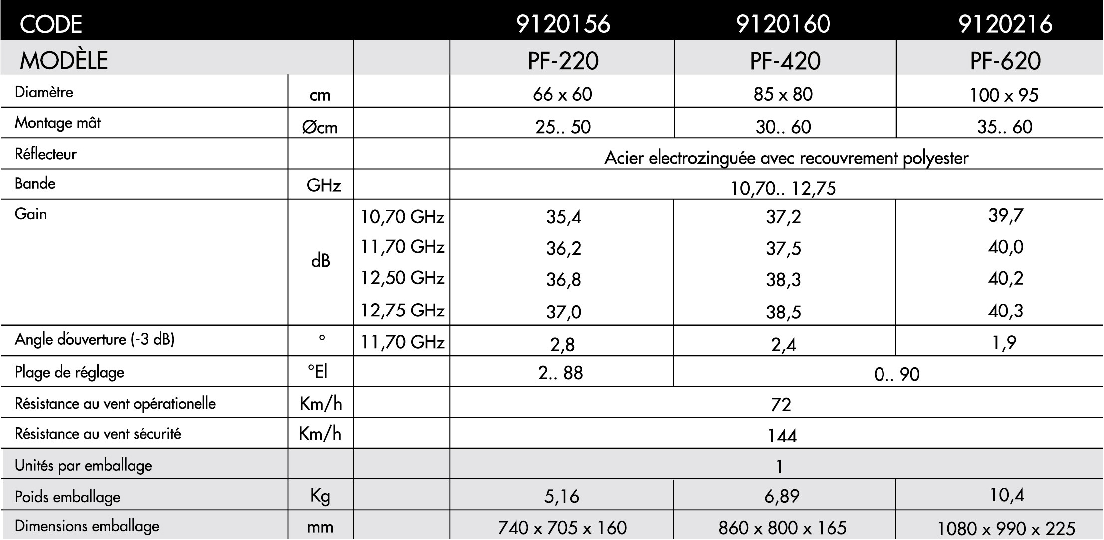Convient aux installations de télévision par satellite, collectives ou individuelles. L'antenne est disponible en trois tailles: 100 x 95 cm pour les installations collectives; 85 x 80 cm et 65 x 60 cm pour les installations individuelles.