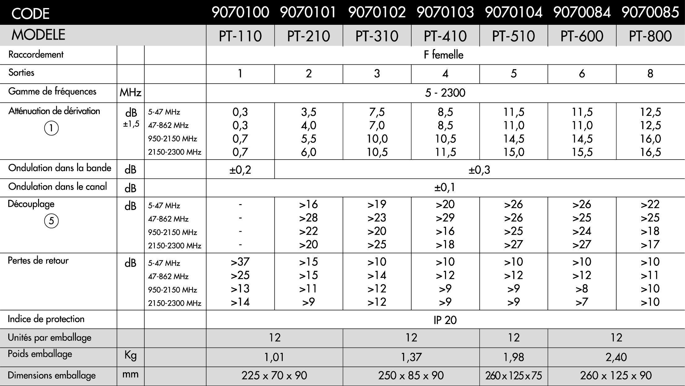 Points d'accès utilisateur pour la télévision terrestre et satellite. Ils ont deux entrées et plusieurs sorties. L'une des entrées reste connectée aux sorties alors que l'autre entrée est connectée en permanence à une charge 75 ohm. Ils couvrent les fréquences de 5 à 2.300.Spécifiquement conçu pour fonctionner avec le chemin de retour. Disponible avec 6 et 8 sorties.