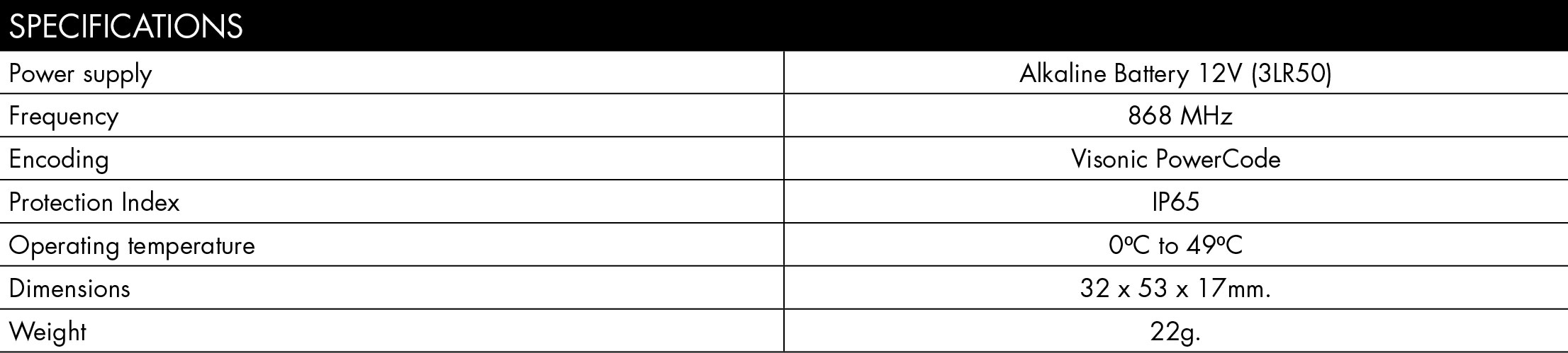 Son canal radio est programmable pour qu'il soit utilisable avec plusieurs récepteurs sans fil et aussi pour éviter tous interférences causées par d'autres bracelets qui se trouvent dans l'hôpital ou la maison de retraite. Alimenté par une pile alcaline de 12 V standard. Comprend un indicateur de batterie faible.