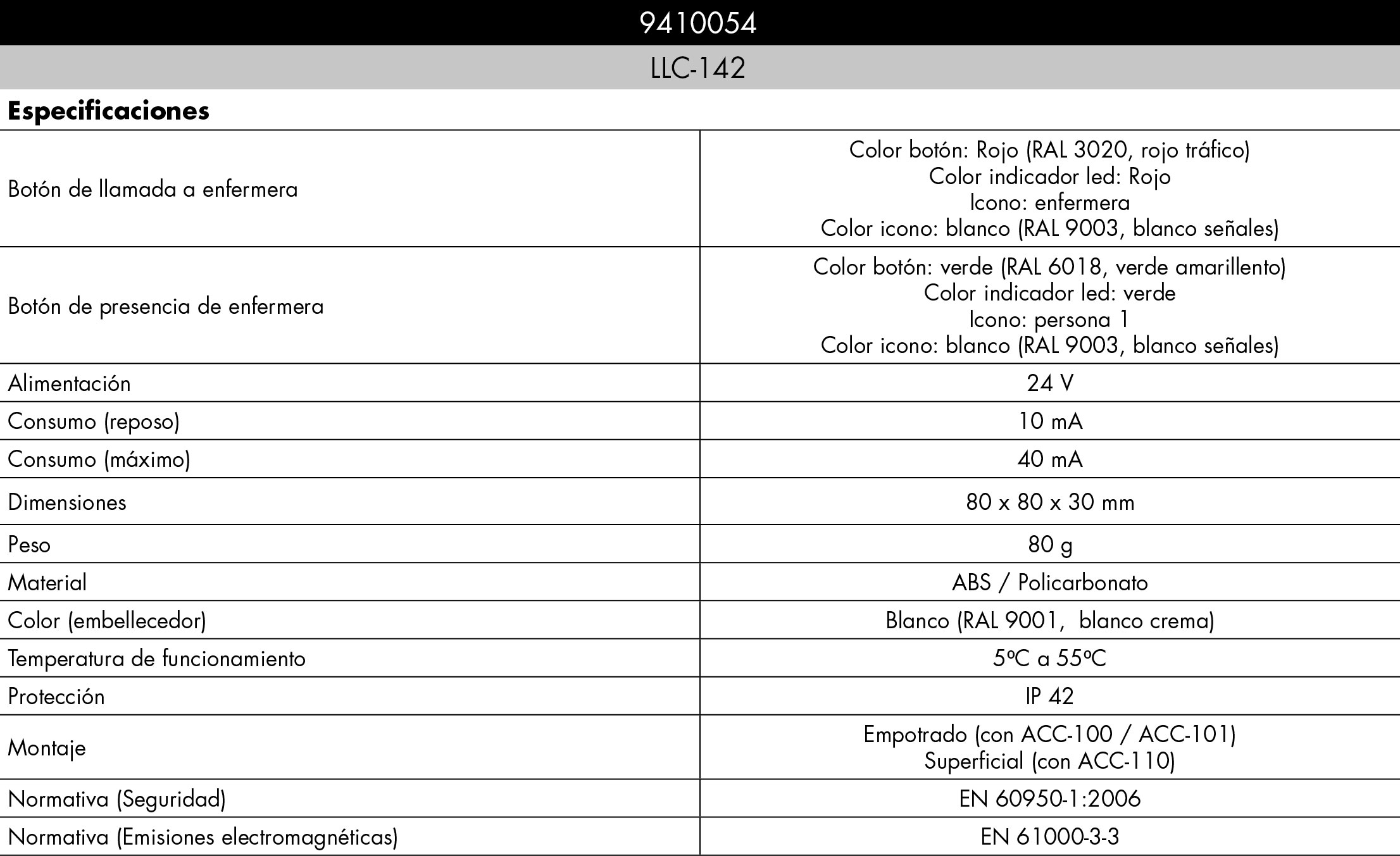 Pièce périphérique avec deux interrupteurs: un interrupteur d'appel d'infirmière avec une LED rouge et un interrupteur de présence d'infirmière avec un une Led indicatrice verte. Ce périphérique permet aux patients d'appeler l'infirmière avec l'interrupteur rouge. Une fois l'appel éffectué, l'une Led indicatrice rouge permet une identification facile du lieu à partir duquel l'appel a été lancé. En plus, l'interrupteur vert permet indiquer le début et / ou la fin de la présence de l'infirmiére dans la chambre, et aussi annuler l'appel. Montage mural ou en surface.