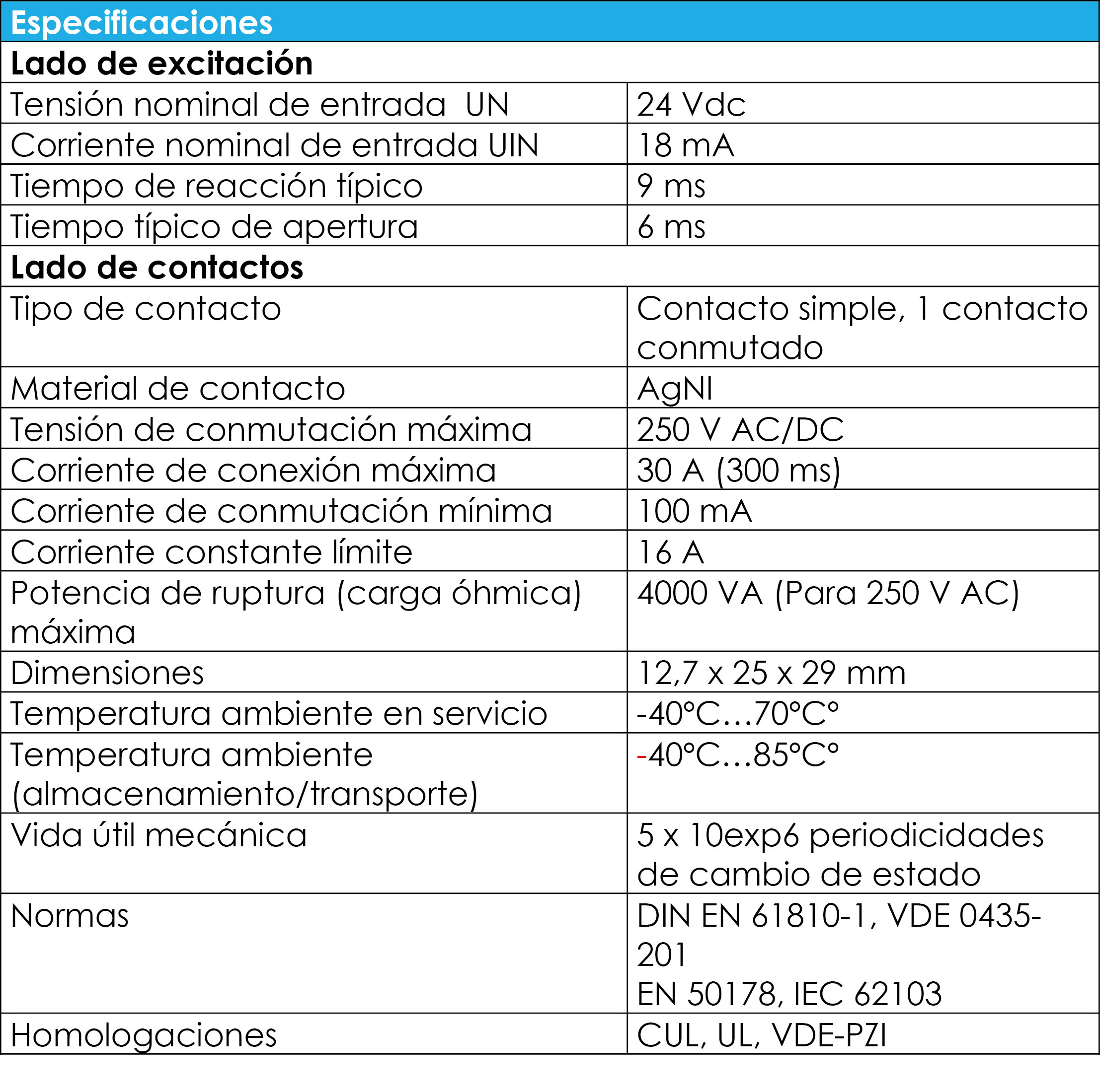 Relés miniaturisé avec prise, contacte de puissance pour haute courant constante, 1 contacte conmuté, touche de vérification, indication mécanique de position de commutation, LED et diode libre circulation integr., tension d'entrée 24 V DC.