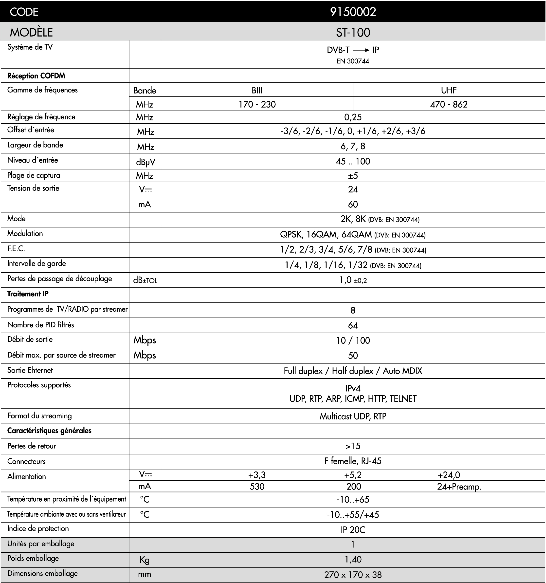 Le module de streaming ST-100 (DVB-T sur IP) est une solution professionnelle pour encoder un maximum de 8 signaux TV / radio d'un multiplex DVB-T au format H.264 afin qu'ils puissent être transmis en tant que flux de multidiffusion dans un réseau IP. Le module est idéal pour distribuer le contenu vidéo dans de grands bâtiments comme les écoles, hôtels, hôpitaux, magasins, centres commerciaux ainsi que les applications de signalisation numérique.