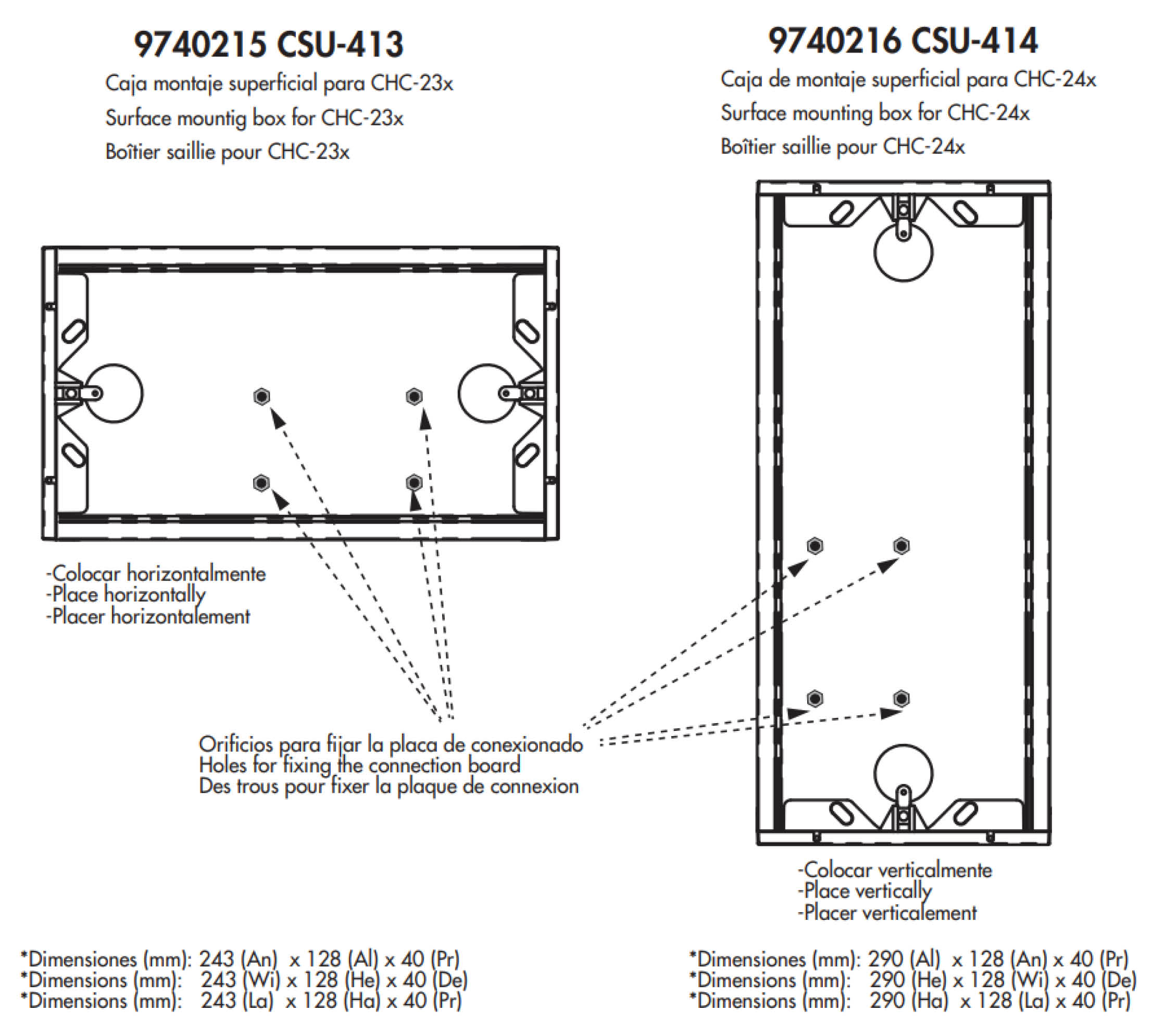 Boitier dinstallation en saillie des terminaux CHC-23X et CHC-24X. Des vis préinstallées sont fournies pour la fixation de la plaque de branchement nécessaire au raccord des dispositifs périphériques de la chambre et de lalimentation.