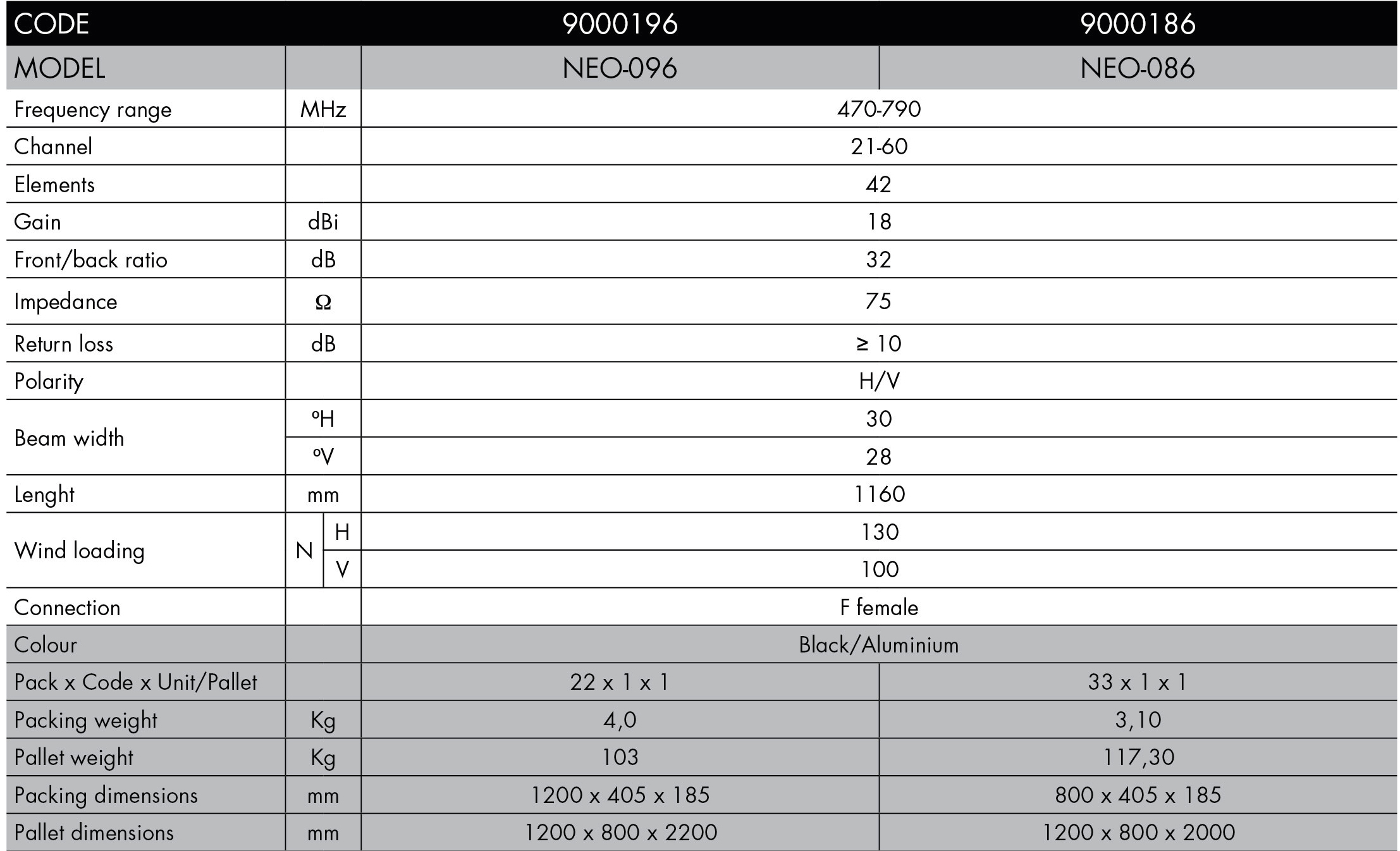 Antennes avec la meilleure réception des canaux TNT et à gain élevé (18 dBi). Conçues pour couvrir la bande UHF jusquà 790 MHz, tout en rejetant la bande de téléphonie mobile LTE. Facile à monter et à régler, garantissant une robustesse maximale et la plus grande sécurité pendant linstallation. Dune conception élégante qui reflète à la perfection les excellentes qualités électriques et mécaniques de lantenne.