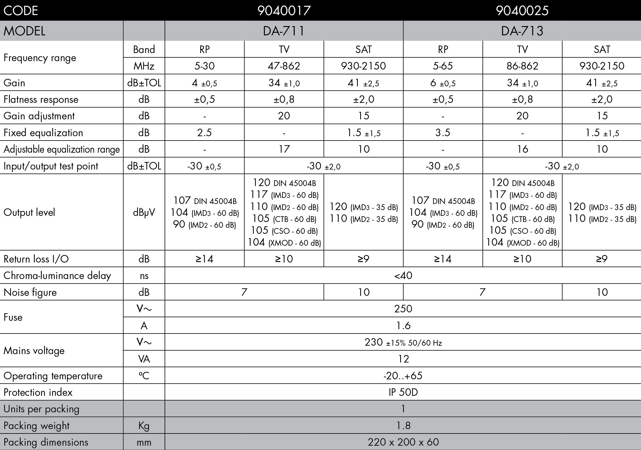 Broadband distribution amplifier for terrestrial TV and IF satellite. It amplifies the return path, and is available in different frequencies according to the model. It has a gain control and slope control on each TV and SAT band. Fed by a built-in switching power supply. The input and output test point permits the checking and adjustment of the installation without having to disconnect the TV signal.