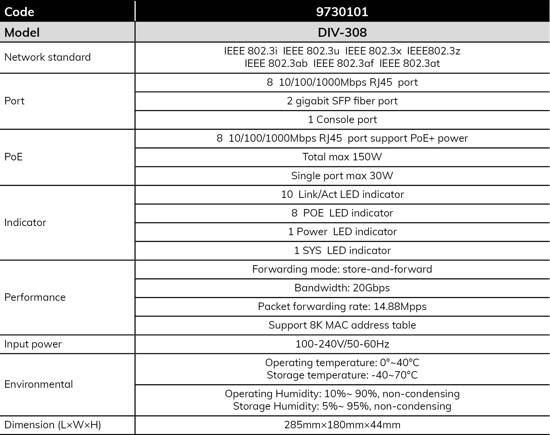 Accessory for Door Entry Systems installations. Derivator Switch IP system. 8 PoE bypass outputs. 1 input and 8 output pass.