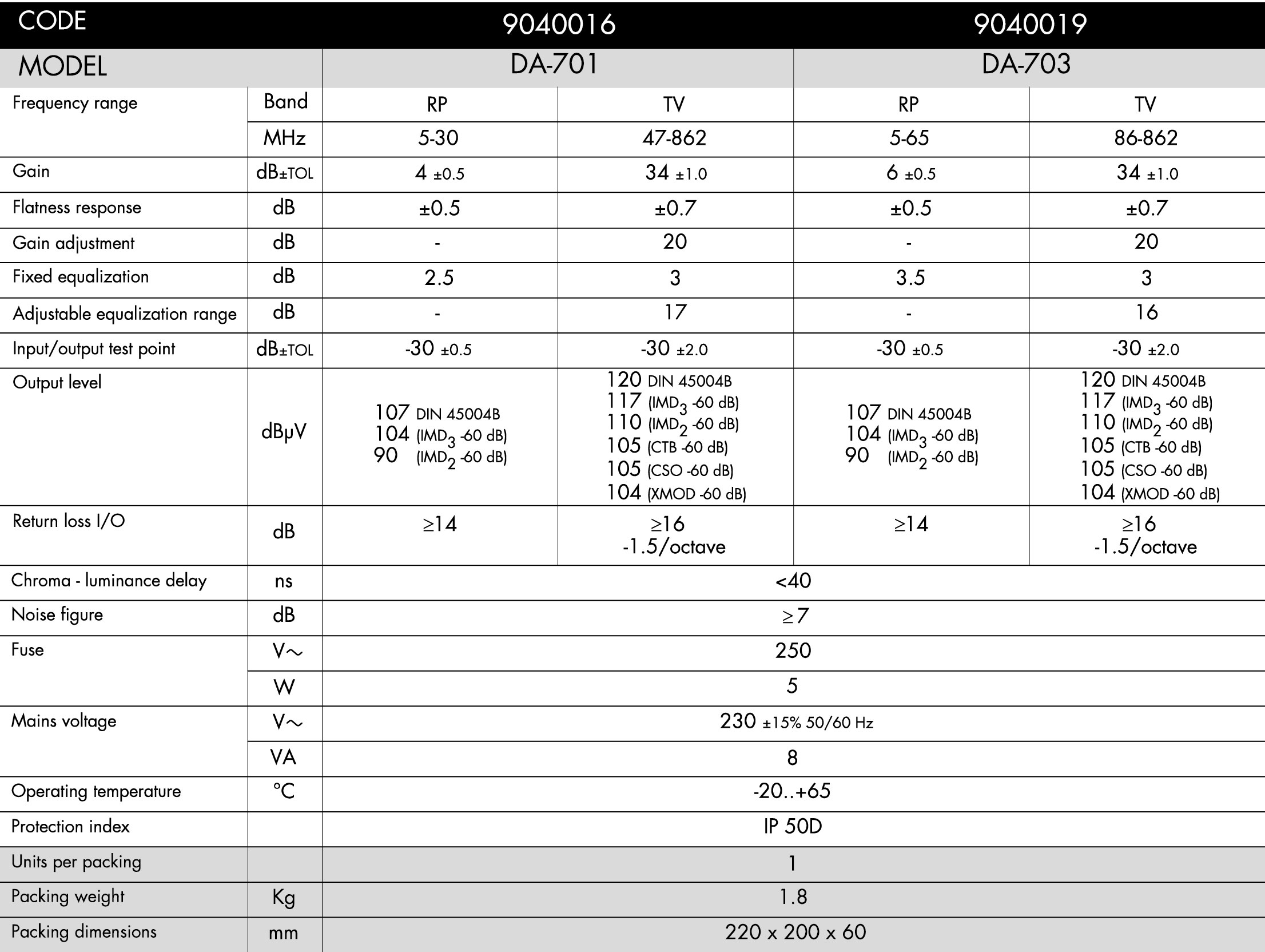 Broadband distribution amplifier for terrestrial TV. It has a gain control and variable slope control. It amplifies the return path, and is available in different frequencies according to the model. Fed by a built-in switching power supply. The input and output test point permits the checking and adjustment of the installation without having to disconnect the TV signal.