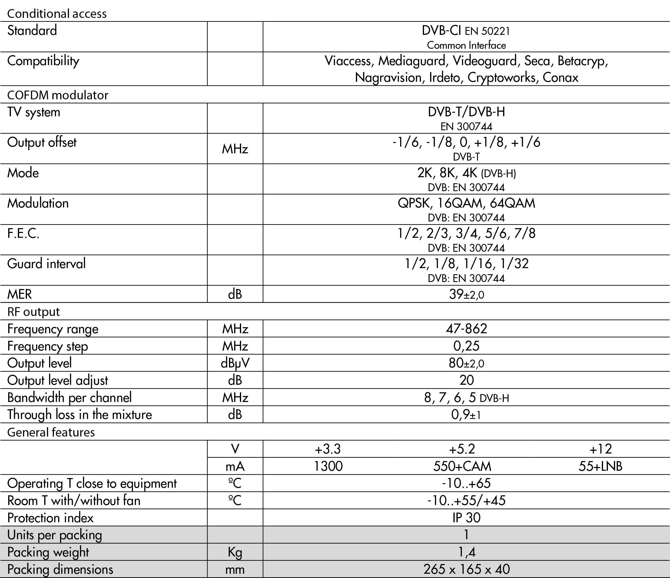 Automatic error-detection system which greatly reduces maintenance work on the installation. Generated output channels of oustanding quality. Does not include the CAM or the decoder card. Zamak chassis with metal side panels. F-type connectors. The equipment can be assembled quickly and easily.