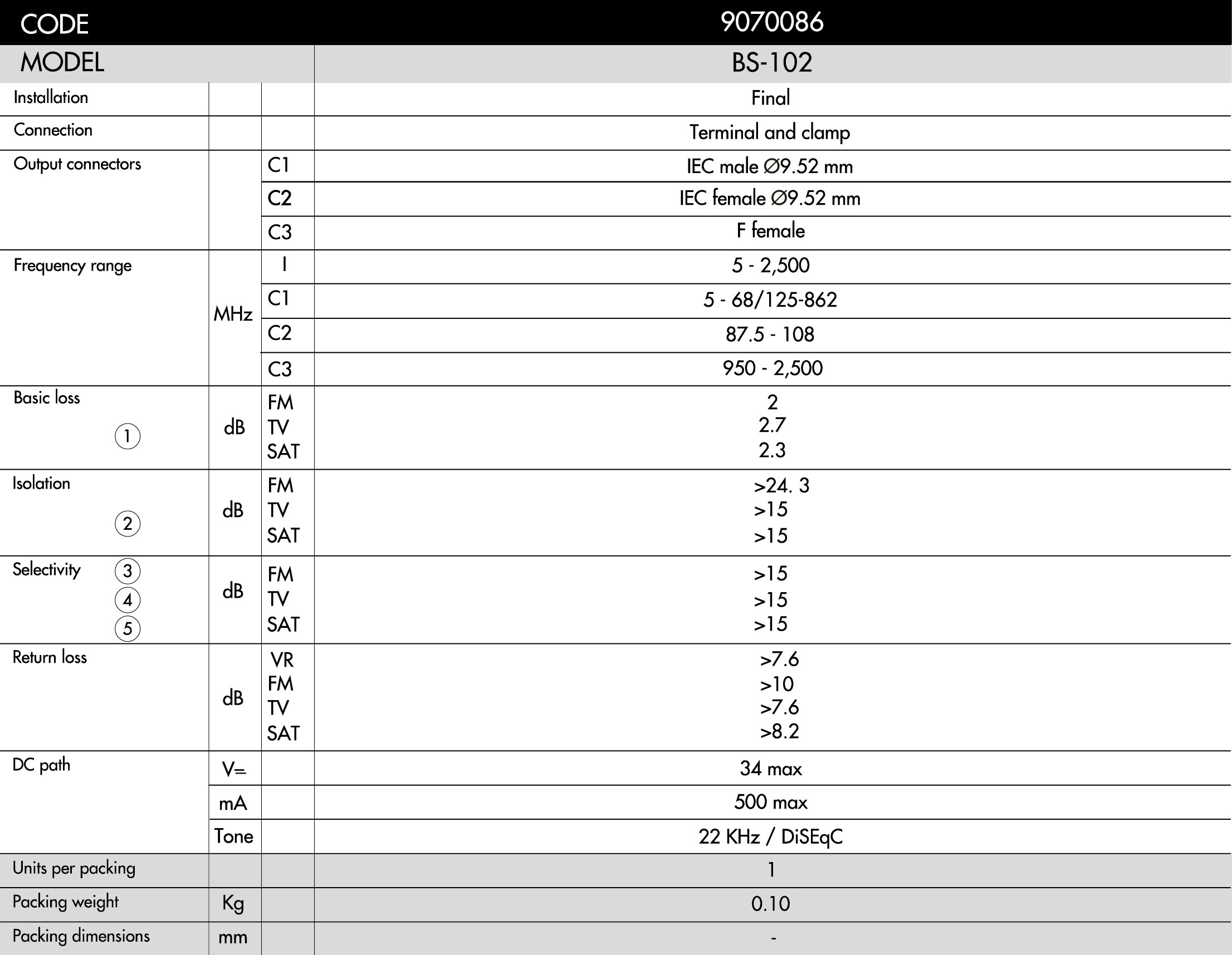 Outlets for terrestrial and satellite TV with three male IEC connectors, an IEC female connector and an F-type female connector. They cover frequencies up to 2,300MHz. They allow a feed path via the female F-type connector to the input.