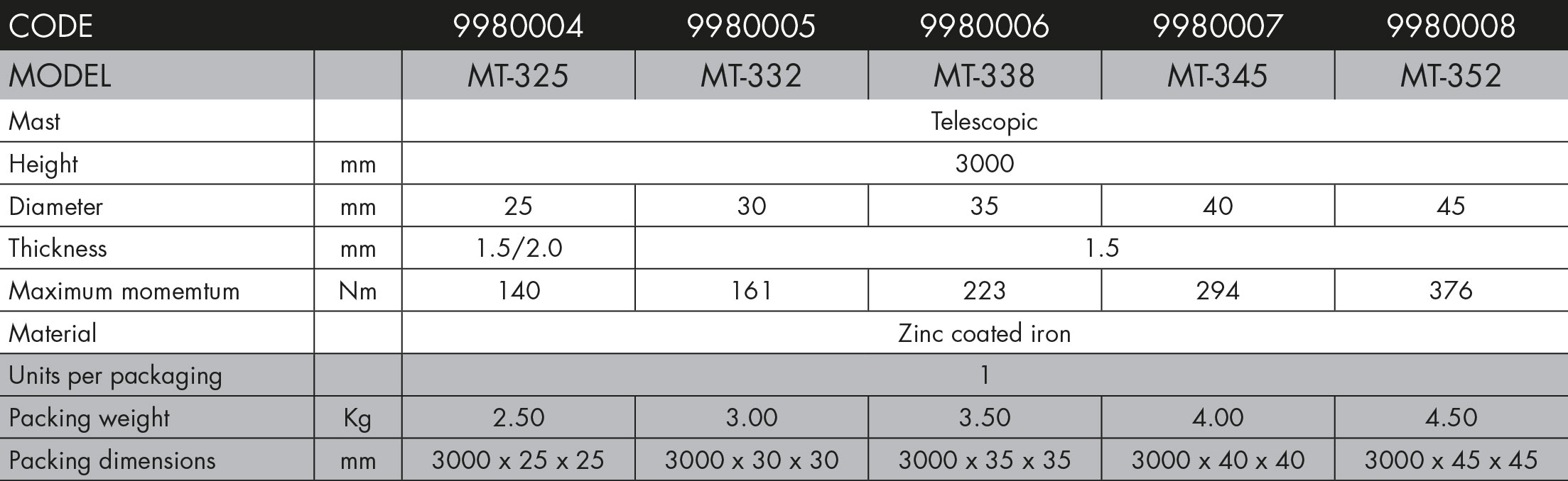Made from round, zinc-coated iron tube. The different sections of the mast are assembled by inserting the upper part of the mast into the lower part of the other section securing them with an M10 screw.