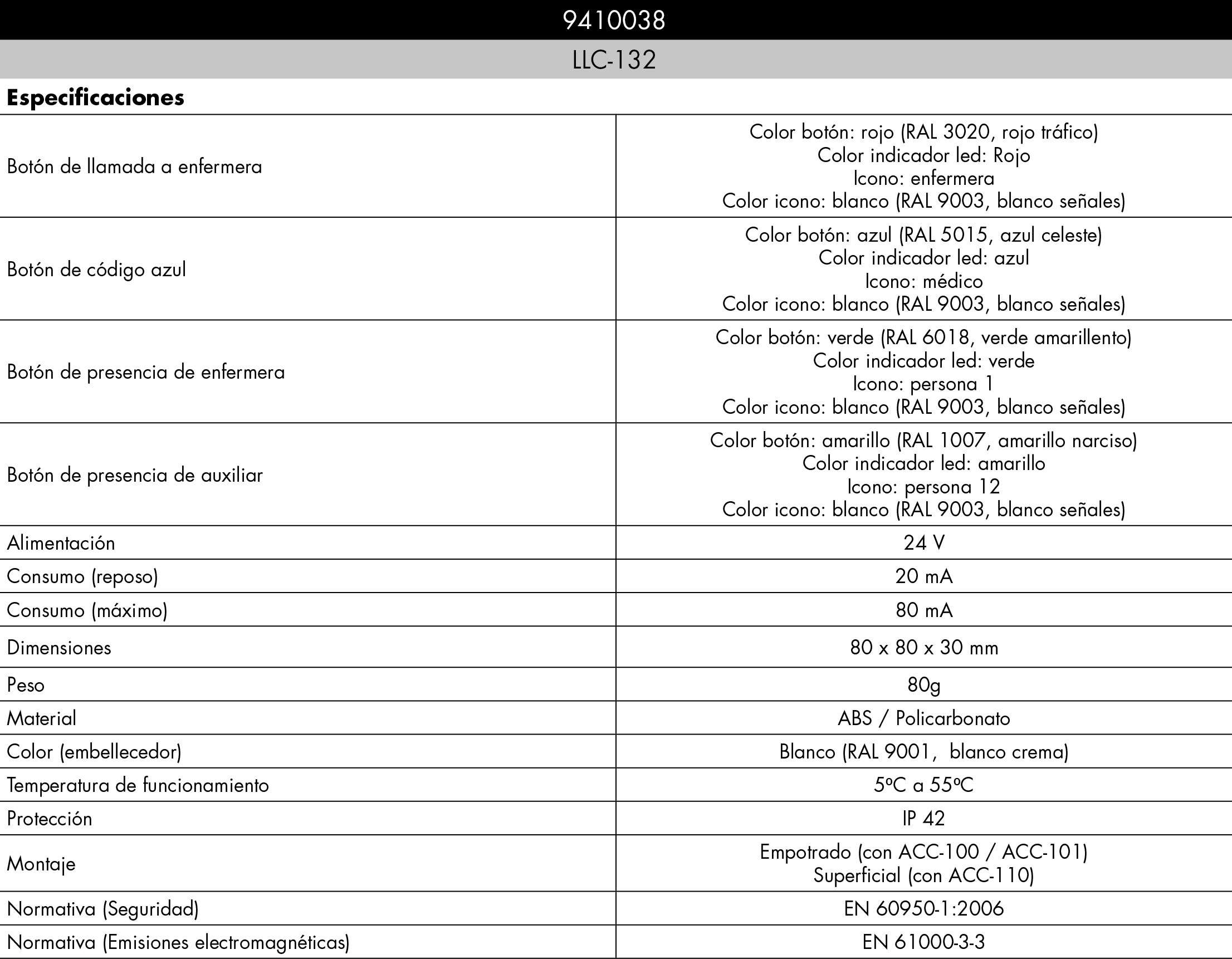 Room peripheral with four buttons: a nurse call button with a red LED, a doctor call button with a blue LED, a nurse presence button with a green LED indicator and an assistant presence button with a yellow LED. This peripheral allows patients to call the nurse with the red button or the doctor with the blue button. Also, it allows the nurse to indicate the start and/or end of their presence in the room by activating the green present/away button, while the green LED allows to identify the presence status of the nurse in the room. Likewise, their assistant indicates their presence using the yellow present/away button. Wall or surface mount.