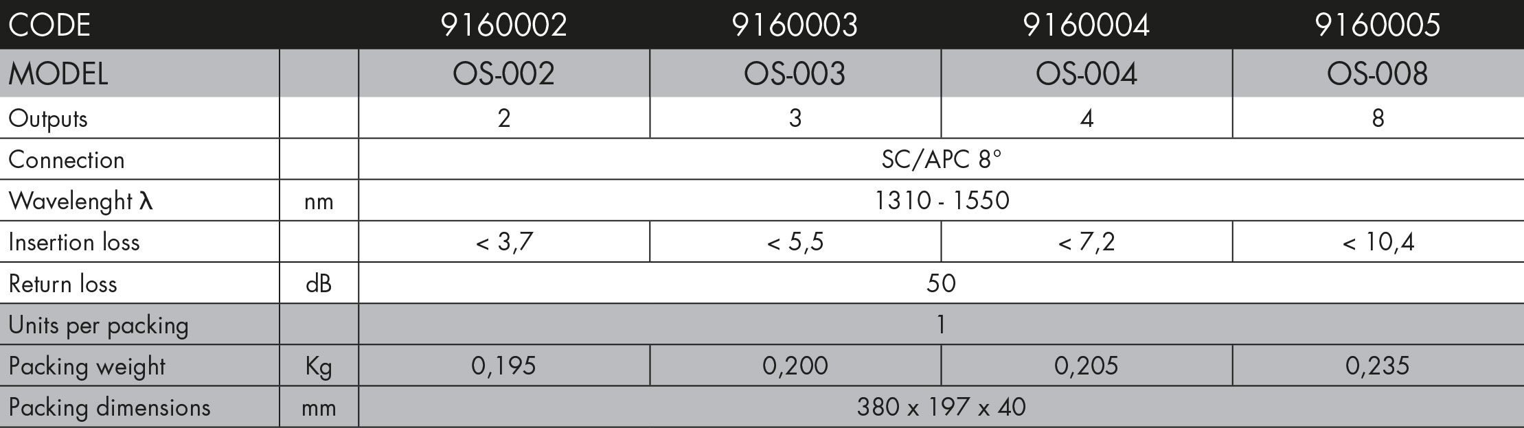 Optical fibre splitters with 2, 3, 4 and 8 outputs. The optical signal is distributed equally to all the outputs. The input and the outputs are separated and clearly identified.