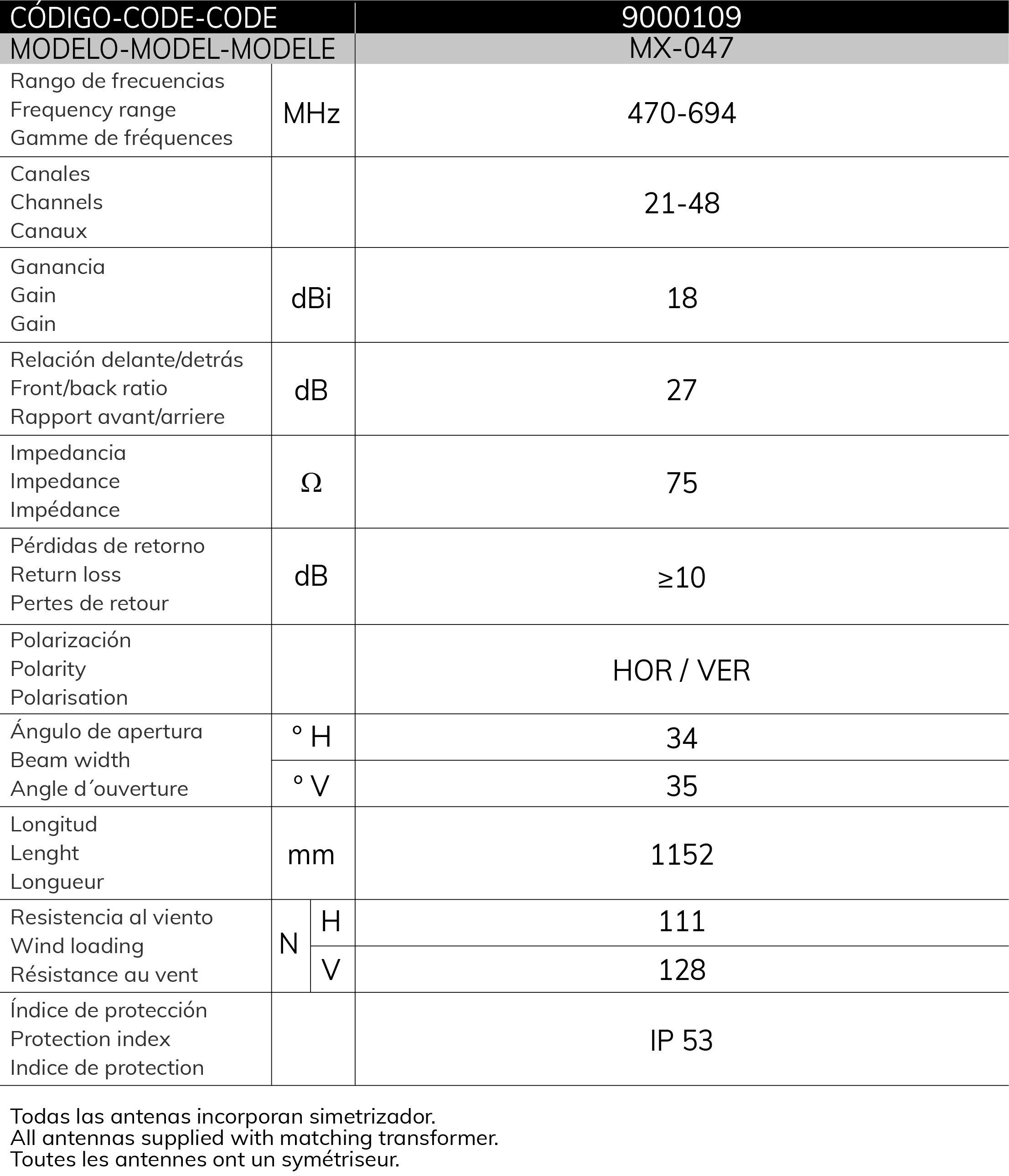 UHF ANTENNA MX, CHANNELS 21/48, G =18dBi